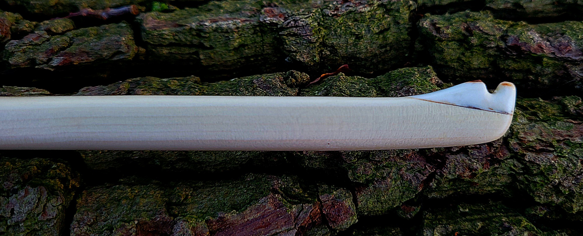 Roter Hartriegel im letzten Januar abgesägt. Am unteren Ende hatte er 8cm Durchmesser mit Rinde. Mit Knick gewachsen. Daraus resultiert der leicht zurückgesetzte Griff. Viel Reflex hatte er aber nicht. 154cm Länge NzN. Unten etwa 2cm kürzer als oben. Mehr Länge war leider für keinen der Wurfarme mögl ...