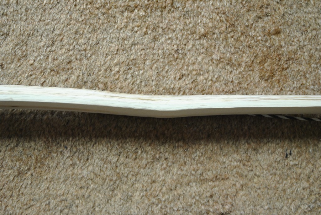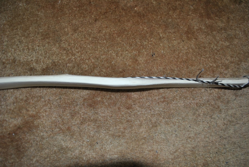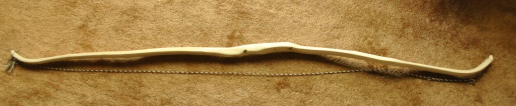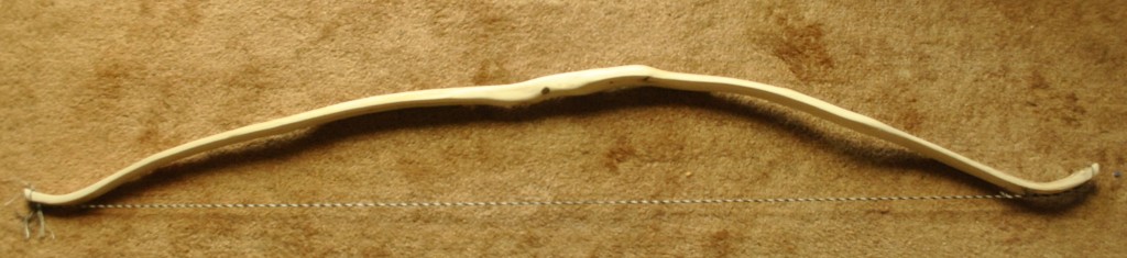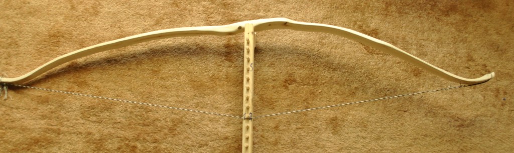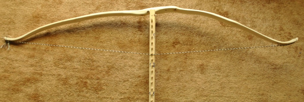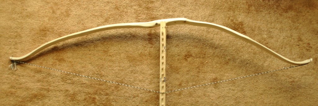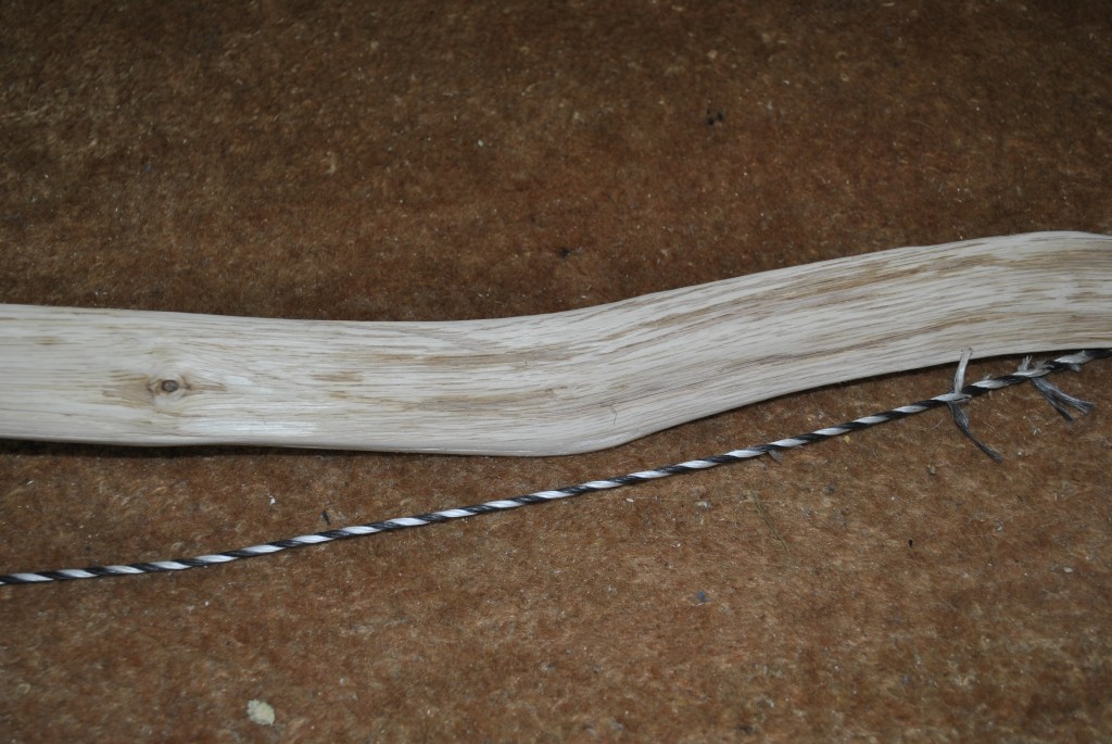 Sehne Endlossehne aus 6 Strang irgendeiner handelsüblichen Papierschnur , Sehnenumwickliung aus Wolle (( Tauglichkeit wurde mit einem gefüllten Kübel überprüft)) (2 Strang halten ca. 9 Liter Wasser samt Kübel) Ganz abgesehen davon, dass mir der "Bogen" echt die Sprache raubt... die Sehne ist aus Pap ...