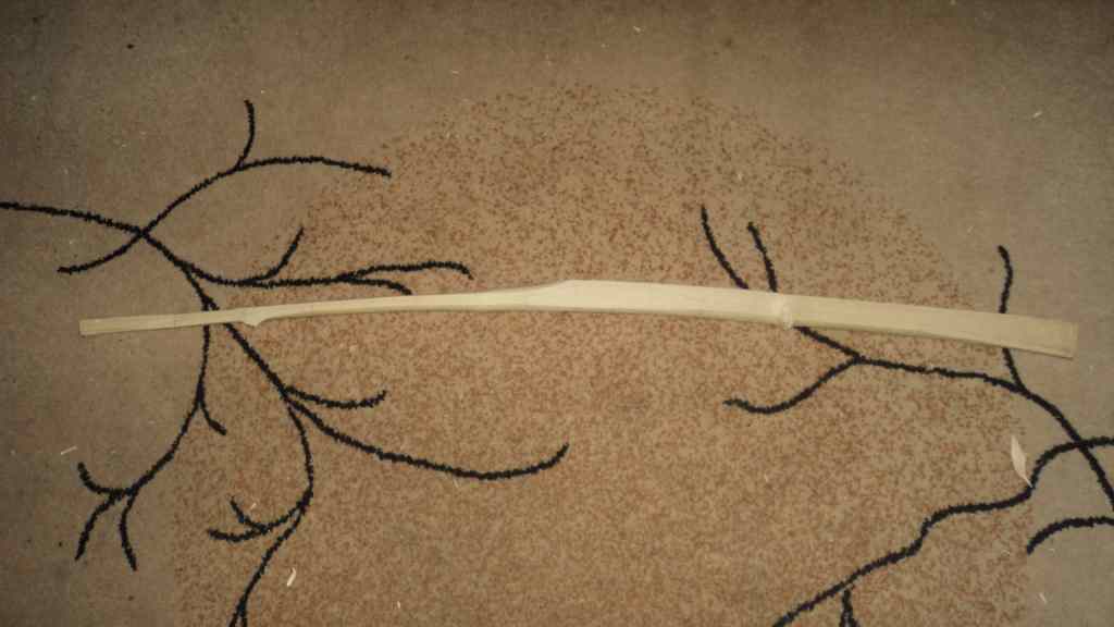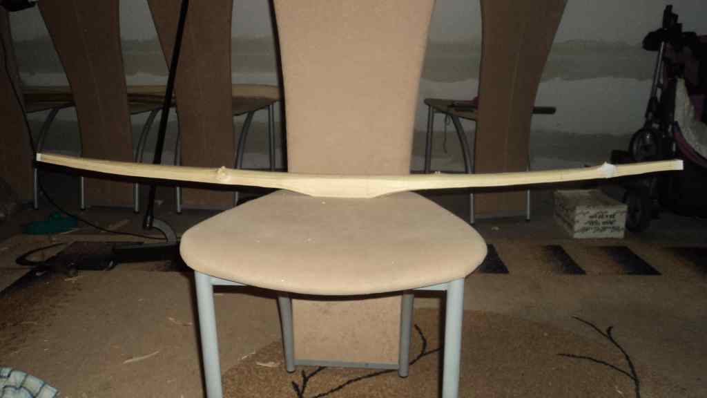 Wenn nicht Rattan... 120cm NtN, 45 # ist für einen Selfbow ziemlich kurz, auch für ca. 24" Auszug. Zudem biegt sich lt. Photo der Griff nicht - Ich würde also den ganzen Bogen mit 2 Lagen Sehne belegen (schön reflex gespannt beim Sehnenbelegen...). Den Knick bekommst du damit nicht sicher raus, ab ...