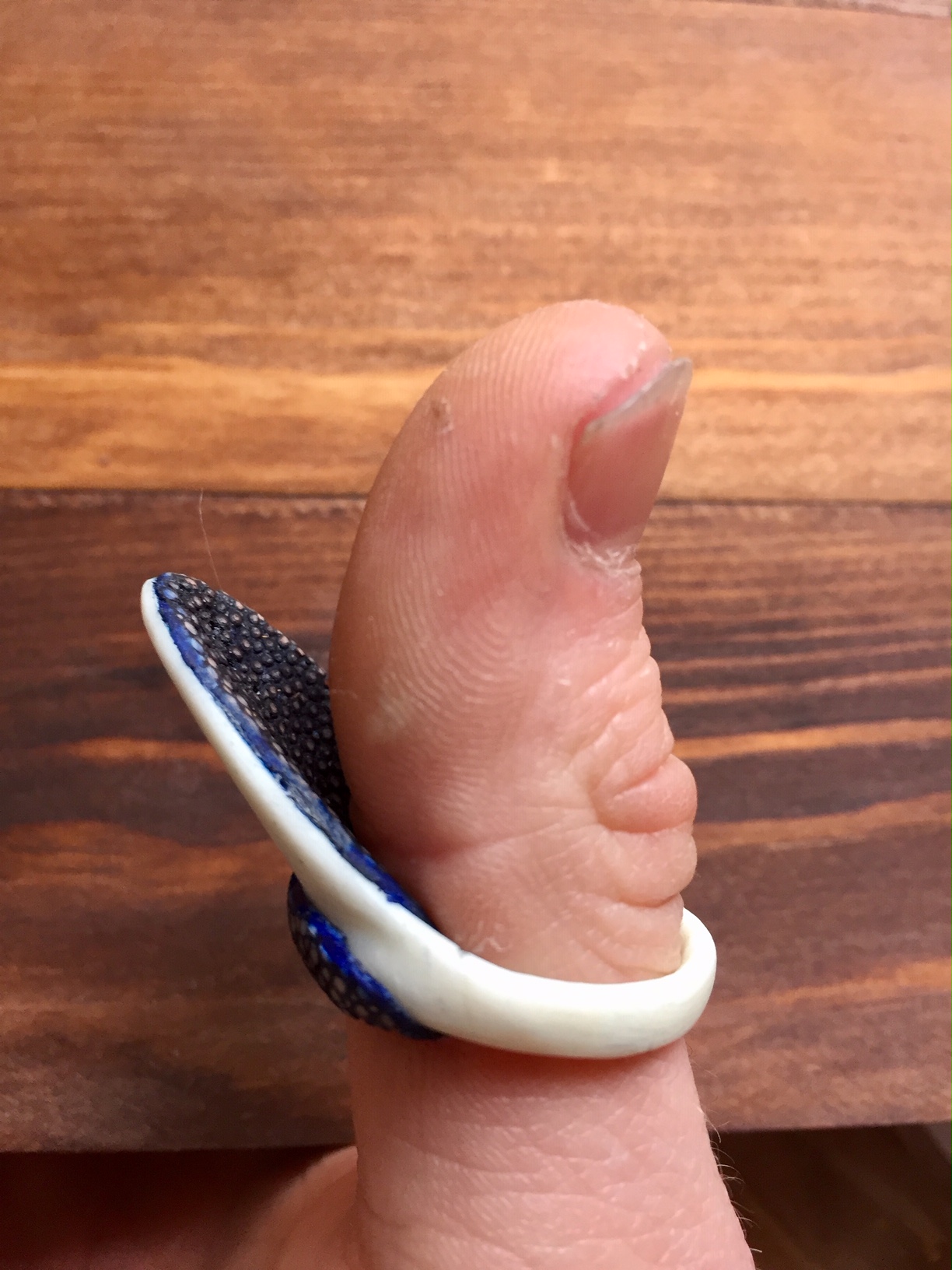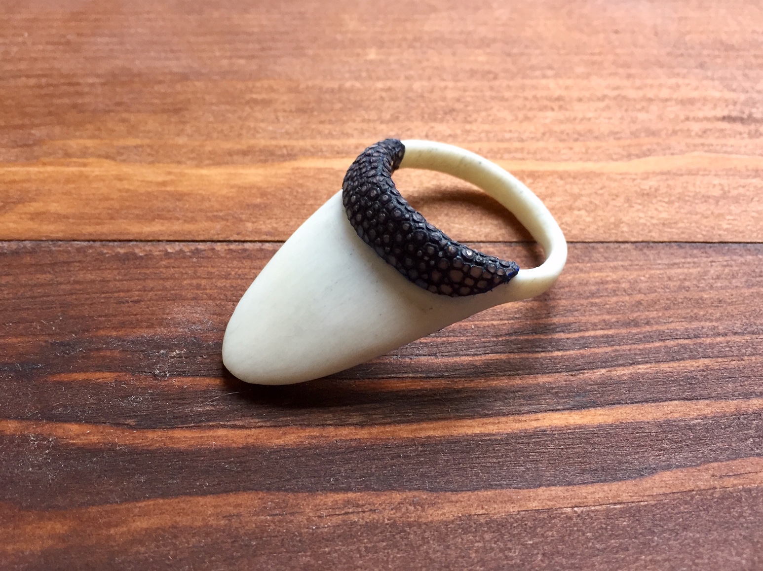 In der Hoffnung, dass mein nächster Komposit hält, habe ich mich auch mal an einem Daumenring versucht. Ich hatte noch Rinderknochen und blaues Rochenleder rumfliegen.