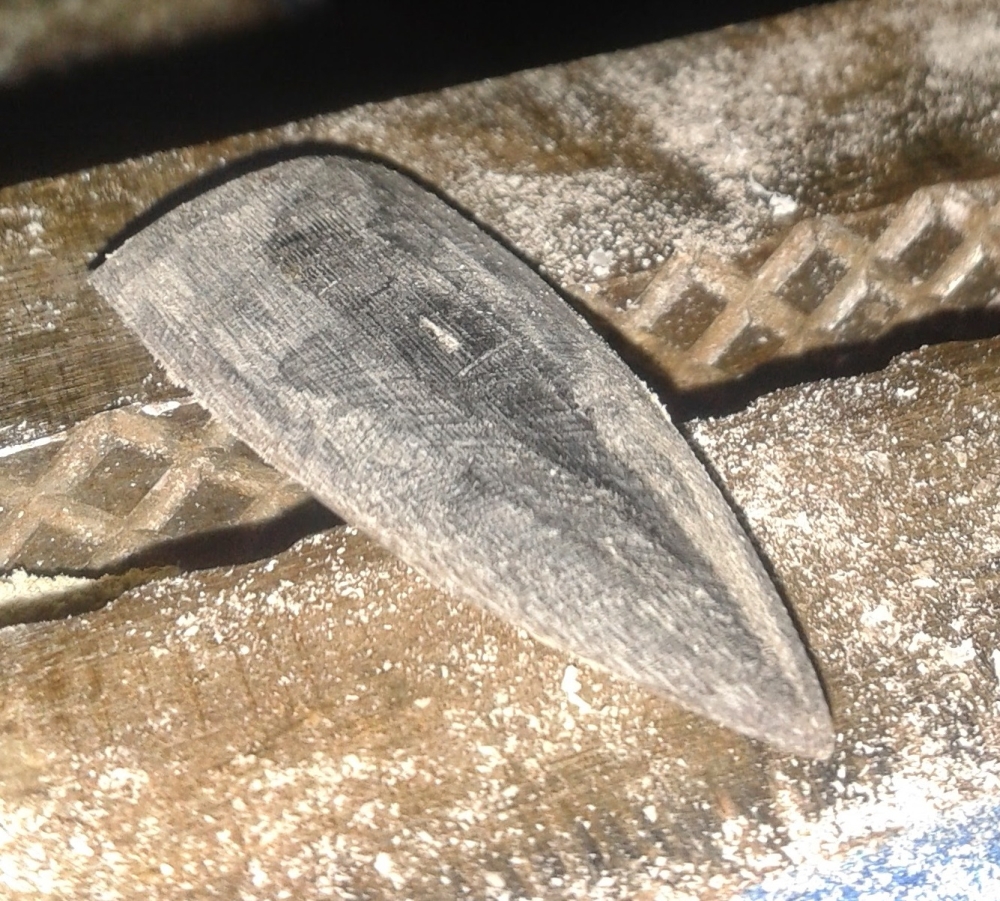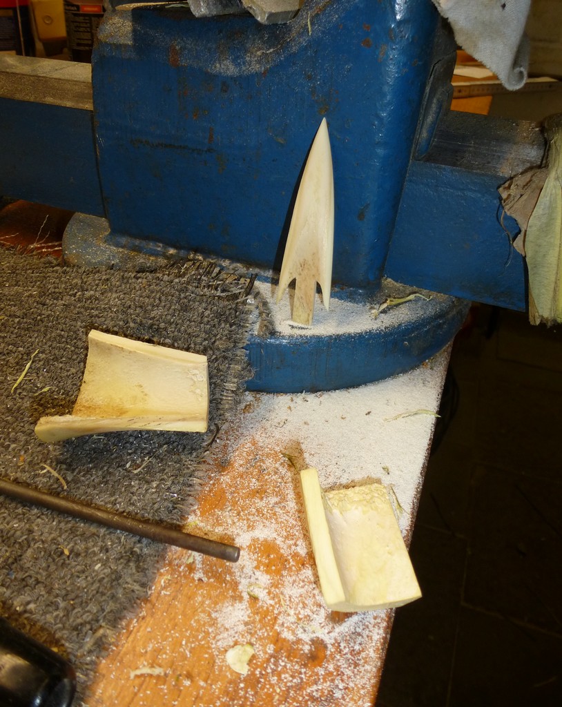 Ein Stück Kuhbein aus den 80ern ist meine erste Pfeilspitze geworden. Grob in Form gebracht hat sie 7,4g (114gr) das wird für die schwereren Schäfte zu leicht sein. Ich werd mir wohl noch ein Stück Kuh vom Metzger besorgen müssen. Aber ich hab noch Baustahl da, mal sehen ob das was wird.