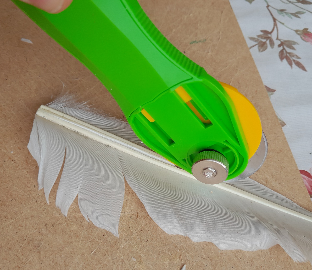 Ich suche mir den brauchbaren Teil der Feder raus, also alles was zu flauschig ist oder der Kiel zu dünn wird abgeschnitten (Schere, Seitenschneider, Nagelklipse, Messer...).