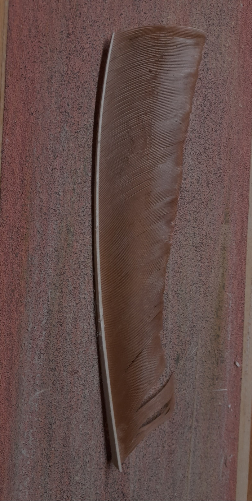 Ich klemme die Feder in einen Zollstock (alternativ: Klammer vom Befiederungsgerät...) und ziehe sie über ein Schleifbrett. Mit Handschleifklotz schleifen geht auch. Ich schleife vom dünnen Kielende zum dicken, damit die Federn nicht so verwurschtelt werden. Wenig Druck genügt bei scharfem Schleifpapier. Körnung 240 geht bei mir gut, gröber ist glaube zu grob.