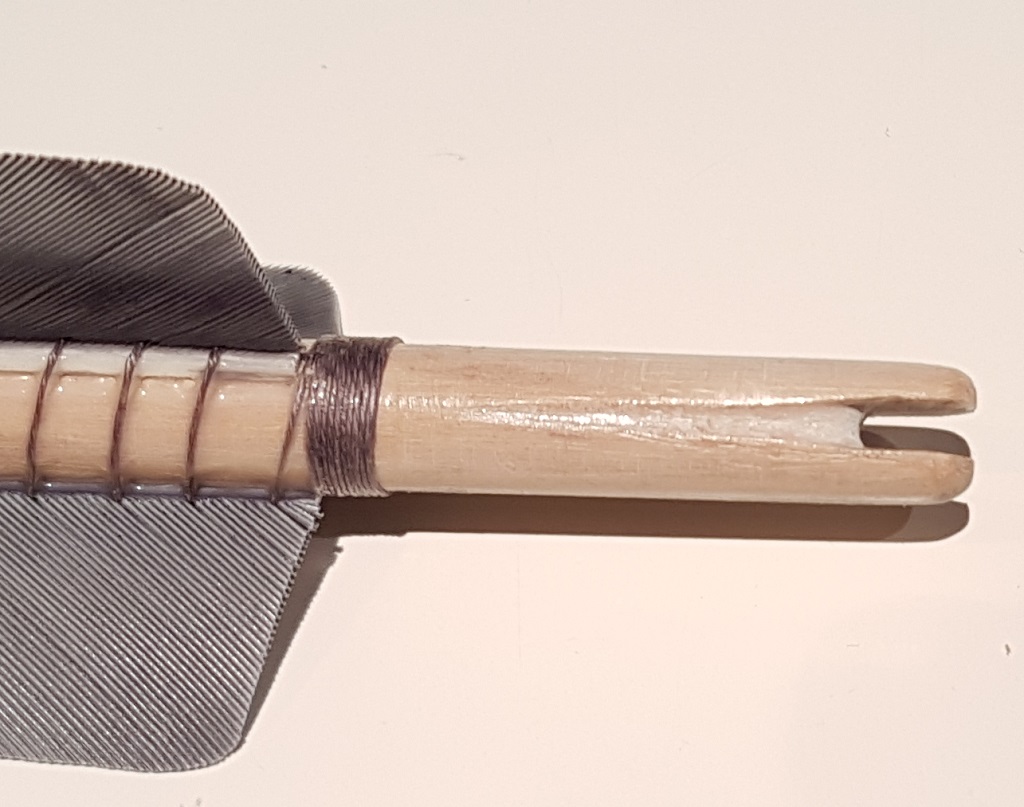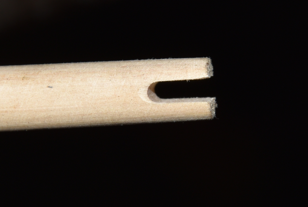 Klemmende Selfnocks habe ich nie verläßlich hinbekommen und möchte es gar nicht. Wichtiger ist mir aber, das der Pfeil möglichst locker auf der Sehne sitzt und von der Sehne möglichst wenig seitliche Bewegung abbekommen kann, wenn der Pfeil die Sehne verläßt. Ich mache die Nocke deshalb immer etwas V-förmig, damit der Pfeil die Sehne ohne weitere Berührung verlassen kann.