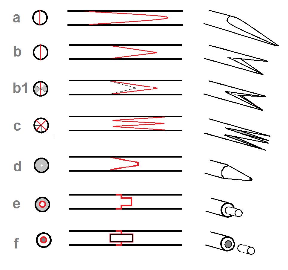 f) Dübel. Variante von e). In beide, Vor- und Hauptschaft, werden lineare Tüllen gebohrt, ein passgenauer Dübel verbindet beide Teile. Zur Erhöhung der Haltbarkeit kann man zusätzlich (NACH dem Bohren!) einen kurzen Diagonalspleiß anbringen (Spleißlänge der Bohrtiefe zugeben!). Besonders haltbare Materialien als Dübel bringen hingegen wenig Vorteil. (Ein Schaft bricht an der Außenschicht zuerst!). Einfacher als e). Ergänzt (s.u.):