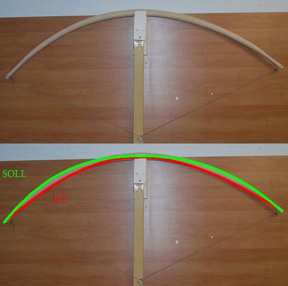 Der Teil zwischen WA-Mitte und Beginn der Verjüngung am Ende muss stärker biegen, das entlastet dann auch die viel zu stark biegende Mitte!