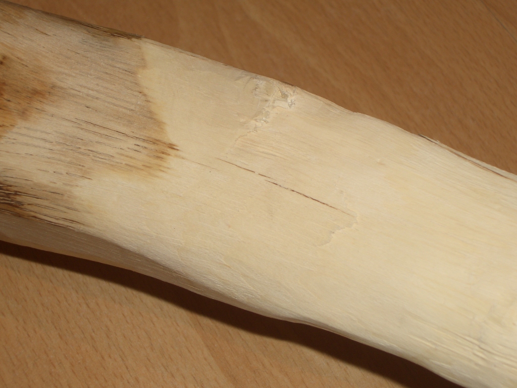 Wie schon befürchtet, hat die zweite Biegeaktion auch nicht den gewünschten Erfolg gebracht. Dafür entwickelt das Holz durch den Stress jetzt am Rücken Längsrisse. Evtl bleiben die noch im Fadebereich. Wird aber wohl ziemlich sicher ne Wicklung werden.