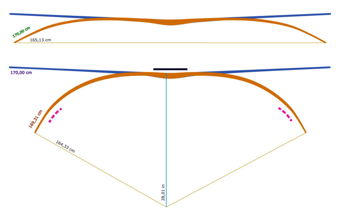 Irgendwo, den Faden finde ich gerade nicht mehr, hat jemand vorgeschlagen den Griffbereich etwas leichter bzw. dünner anzulegen, damit er leicht mit biegt und nicht die ganze Biegung auf der kurzen Strecke zwischen Fadeouts und den steifen Enden geschehen muss. Das scheint mir Sinn zu machen, also würde ich versuchen, Griff und Fades so anzulegen, dass eben spätestens in den Fades der Bogen leicht mit biegt um den Rest der WA zu entlasten. Also nicht mehr ganz der klassische Flachbogentiller mit vollkommen steifem Griff. Bei meiner Zeichnung biegt der Bogen ja auch schon recht früh in den Fades mit, ist aber einfach beim Erstellen der runden Biegung am PC passiert...