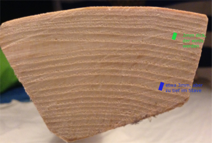 Auch wenn man es vielleicht nicht gut erkennt, hat der relativ zu den meisten anderen viel Spätholzanteil und naja, immerhin 2 mm Dicke. Weiter unten wäre ein noch leicht besserer (blau markiert), aber der liegt teilweise schon zu nah am Bauch im Stave.