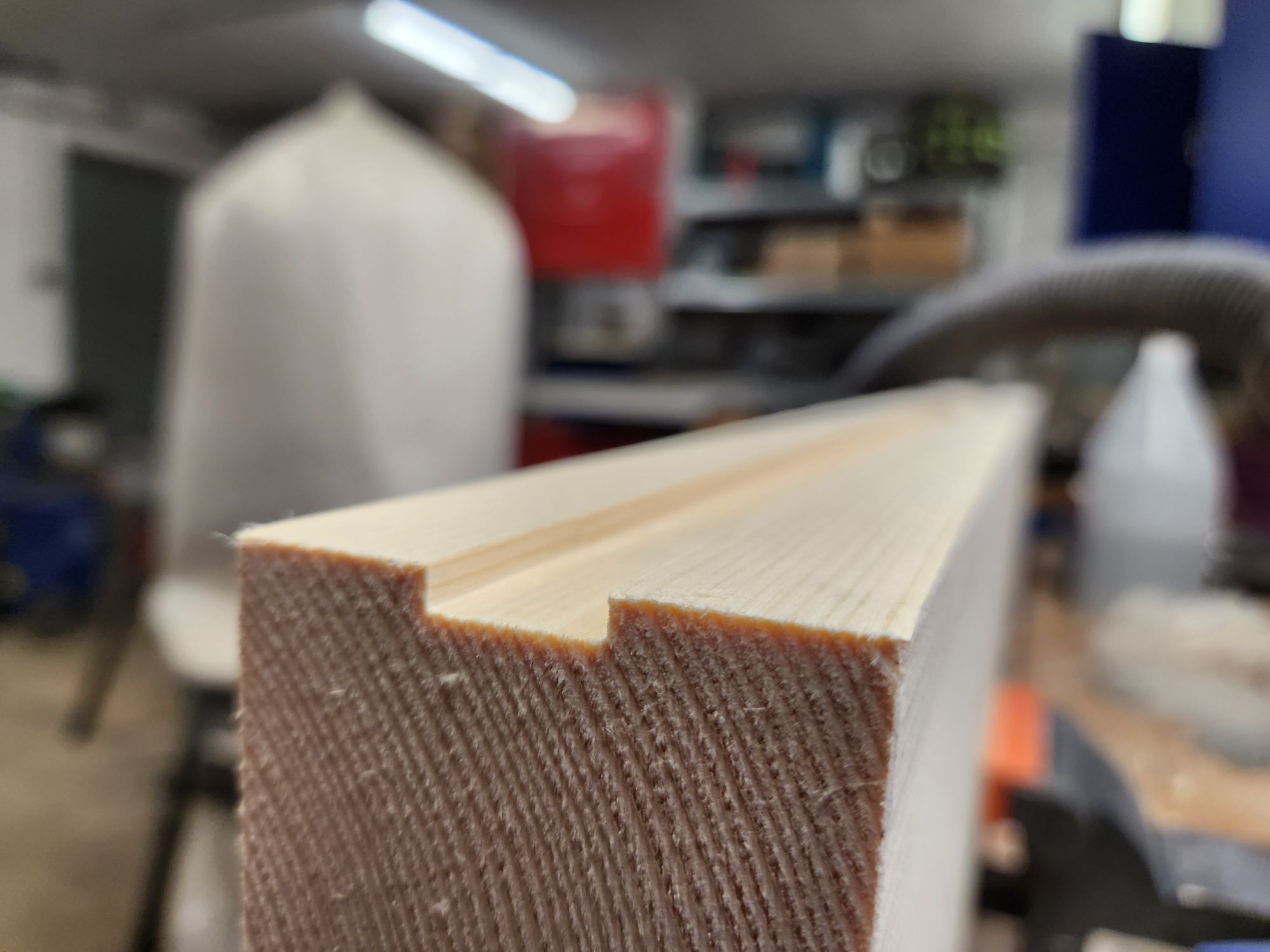 Ich hab jetzt mal mit den neuen Bambusschäften einen Versuch gestartet. Mittig aufsägen ging schon mal super. Dann hab ich mir eine Schleifvorrichtung für meinen neuen Bandschleifer gebaut. Einen dicken Holzklotz auf 28" geschnitten und eine Nut, halb so tief wie die dickste Stelle vom Pfeil werden soll, eingefräßt.