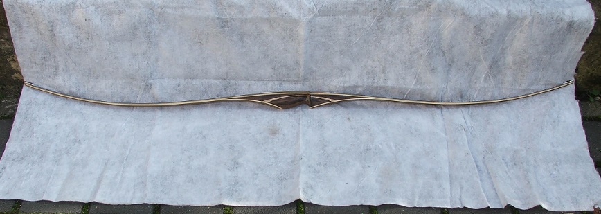 Weniger deflex im Übergang vom Griff in den Wurfarm, hat vorher immer nach zu viel Biegung im Fadeout ausgesehen. Der Rest dann mit dem Kurvenlineal geglättet und ich bin von der Biegung positiv überrascht, schön gleichmäßig. Leider habe ich die 40#@28" bei 68" Länge nicht hinbekommen. Die neue Form mit weniger Deflex, ein nah am Rücken verbautes stabil Core und ein Furnier das 0,7mm statt 0,6mm hat etwas mehr rauskommen lassen. Das stabil Core ist nur wegen dem schönen schwarzen Streifen drin und weil ich mal welches verbauen wollte. Eine Pfeilanlage habe ich noch nicht angebracht um es dem Geschmack eines evtl. Besitzers anpassen zu können da ich ja immer noch den 68 Zöller mit 40# haben will. Da muß ich wohl leider noch mal ran