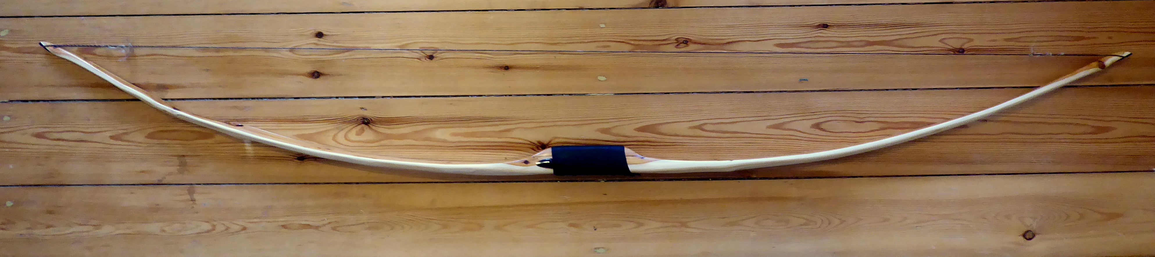 Dieser Bogen entstand aus einem schmalen Stave, deshalb umschließt der Splint das Kernholz bei dem flachen WA-Profil. Im Griff habe ich ein Stück Eibe aufgeklebt. Der größere Totast bedingt den steiferen Abschnitt im Tiller des oberen Wurfarms. Der Bogen wurde ausgiebig eingeschossen, wirft sehr gut und wird dem neuen Besitzer hoffentlich viel Freude machen.