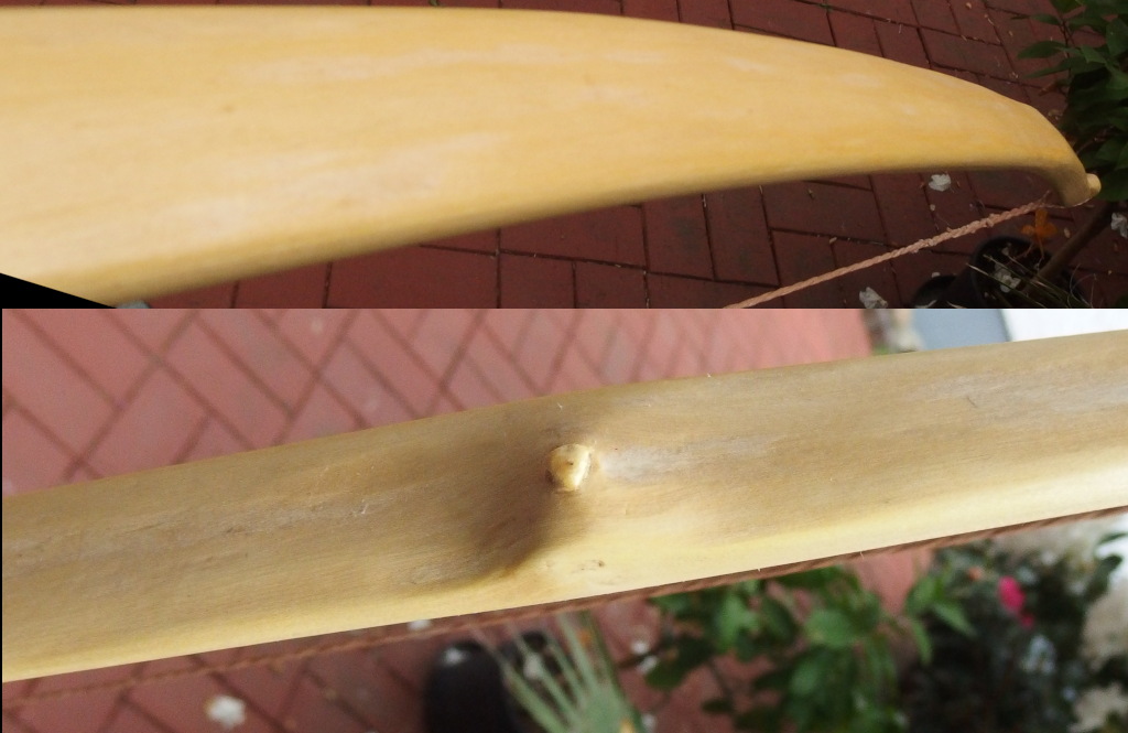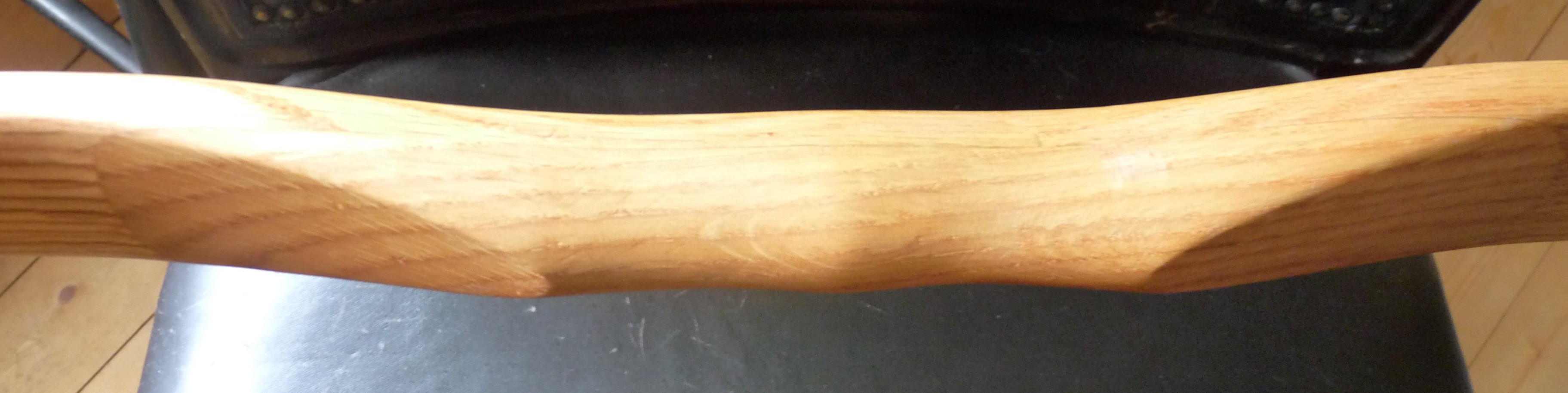 Nach dem Kleben bei ersten Tillerversuchen hatte das Stück noch 60# bei erstem leichten Ziehen (wenige Zoll Auszug), so viel hält also die Klebung aus. Dann habe ich den Bodentiller gemacht usw. Es gab insgesamt zwei Schwachstellen und das Tillern zog sich hin. Am Ende blieben 49# übrig, die bei Vollauszug auf der Zugwaage aber langsam weniger werden, also je länger der Vollauszug geht, desto mehr scheint der Holler sich dauerhaft mitzubiegen und das Zuggewicht sinkt. Das sieht man auch am starken Stringfollow nach dem Abspannen, das aber wieder zurückgeht (Set hat der Bogen auch, auf dem Bild ist ca. die Hälfte der Biegung nach Abspannen noch Stringfollow). Trocken war das Holz aber vor dem Bearbeiten, durch Waage kontrolliert. Die Tips sind leicht seitlich zugespitzt, da der Wurfarm durch die 45° Drehung nach oben hin nicht waagrecht sondern wie ein Dreieck ist. Die Wurfarmenden sind daher einseitig schräg abgeschliffen und mit entsprechenden Stücken aus Holunder besetzt. Holler ist fantastisch zu bearbeiten! Weich, gut zu messern und zu schleifen und reagiert schnell auf Holzabtrag beim Tillern. Und der Bogen schießt richtig knallig. Also ein Experiment mit ungewissem Ausgang, das aber meiner Meinung nach gelungen ist. Die Druckfestigkeit von Holler erscheint mir äußerst gut, der Bogen ist nur 160cm lang und hat beim Tillern enorme Biegeradien mitgemacht lokal ohne einen einzigen Stauchbruch. Die Sehne liegt auch mittig. Dafür, dass ich nicht viel erwartet habe und es alles experimentell ist (daher der Name) bin ich vom Holz und dem Bogen begeistert. Beim Vollauszugsbild habe ich erst gesehen, dass der Sehnenwinkel oben die 90° leicht überschreitet. Ausgerechnet da ist eines der Tipoverlays beim Runterfallen vom Tillerbaum teilweise abgeplatzt und wurde mit einem neuen Stück repariert. Da ist also nicht so wahnsinnig viel Holz und Klebefläche und es muß dieses Zuggewicht bei etwas mehr als 90° halten. Bis jetzt hat er ca. 200 Schuß schon gemacht.