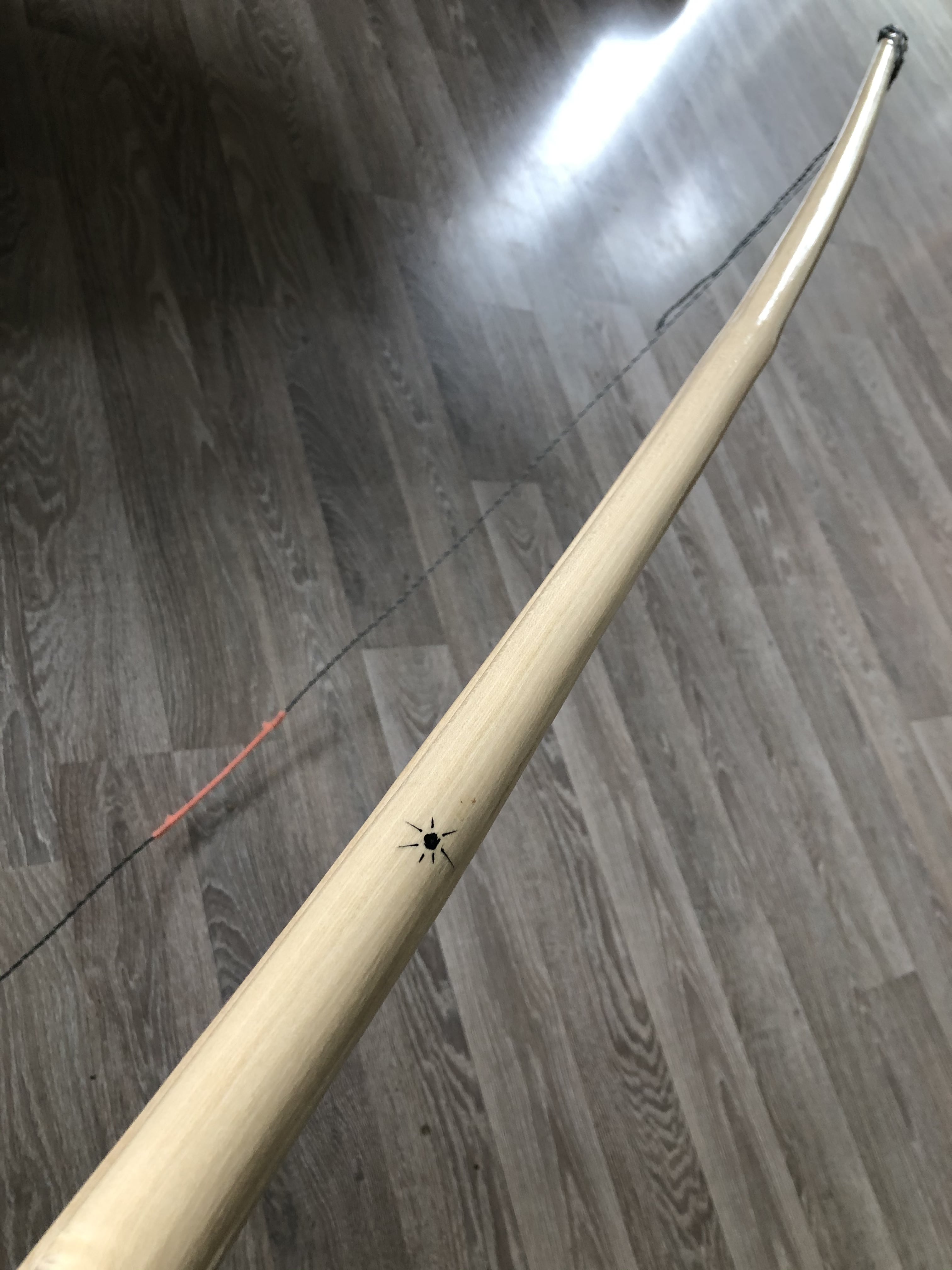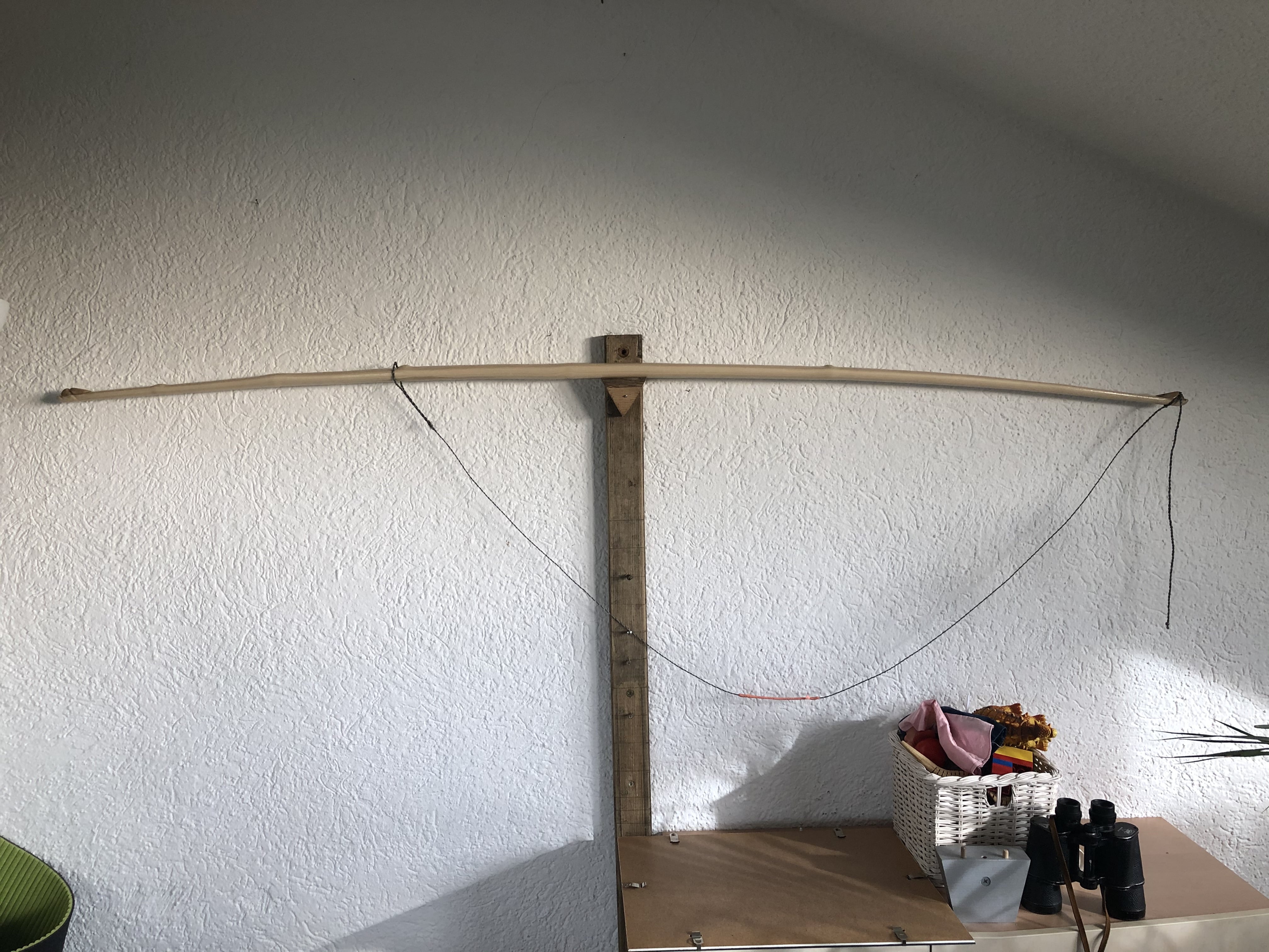 Das Finish besteht aus Stahlwolle-Schliff und drei Schichten Parkett-Versiegelung, die Sehne habe ich aus zahlreichen Metern geflochtener Angeschnur gedreht, die hier noch in der Schublade lag. Funktioniert bestens.