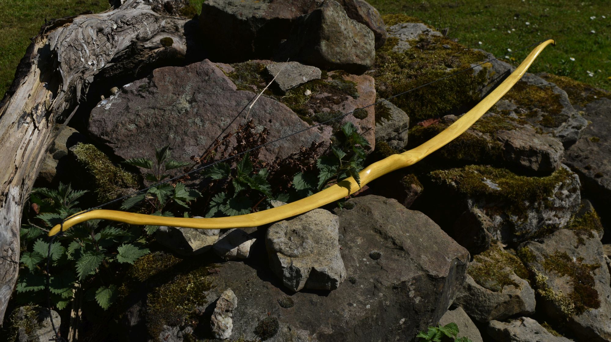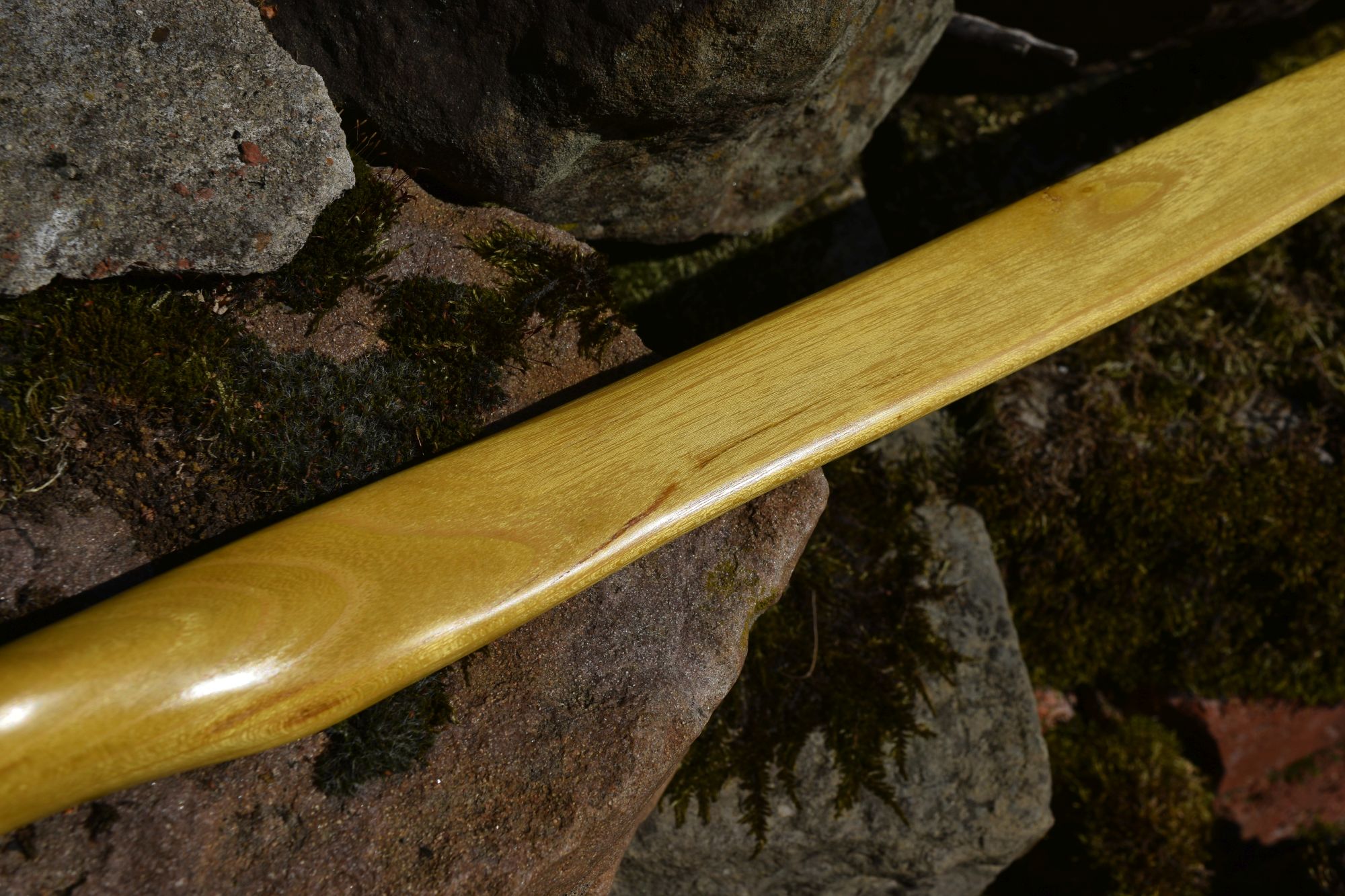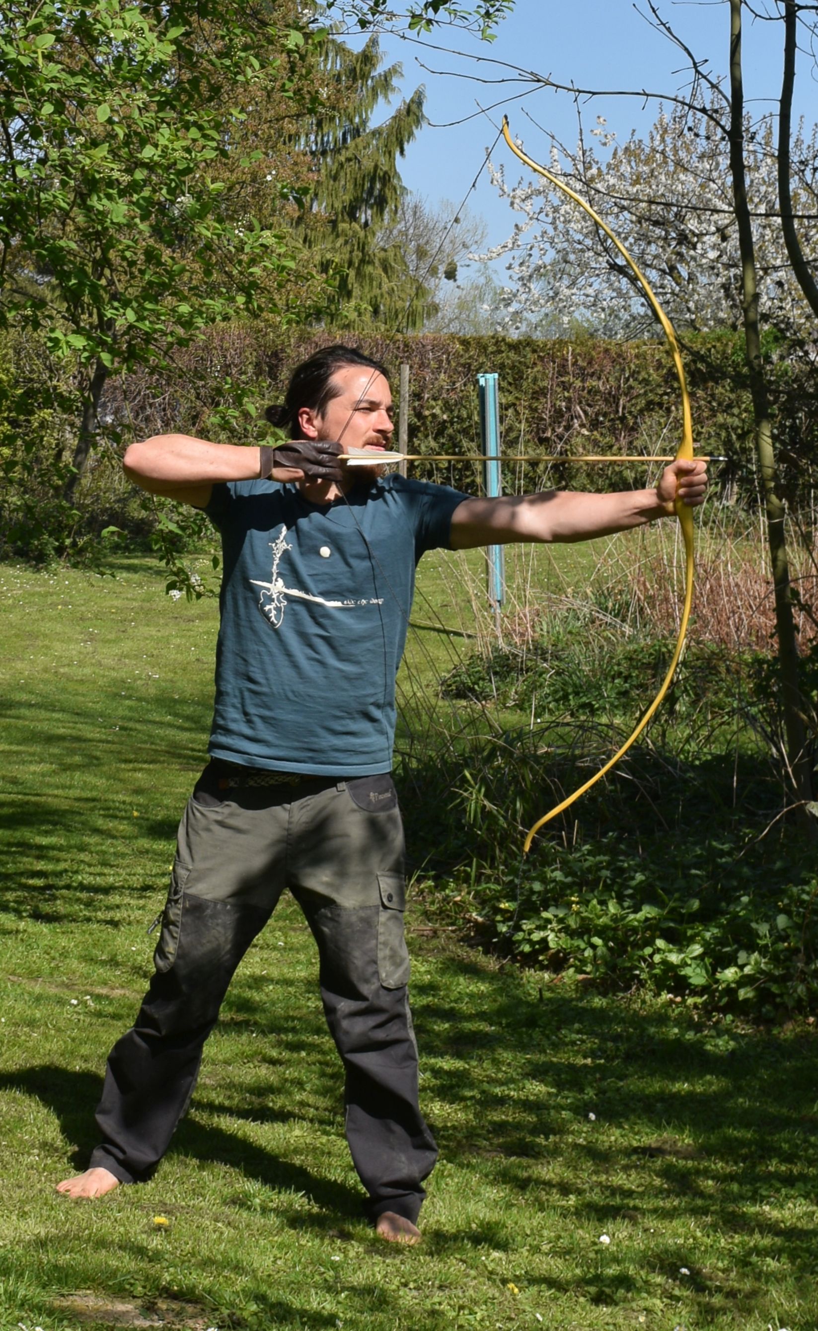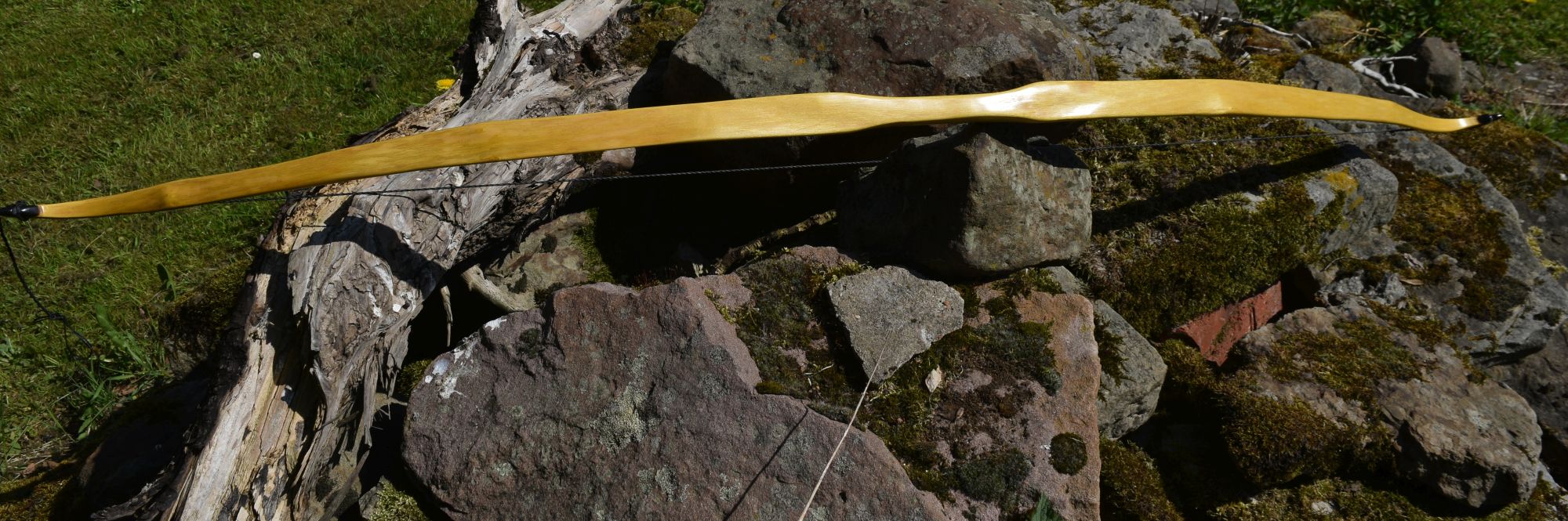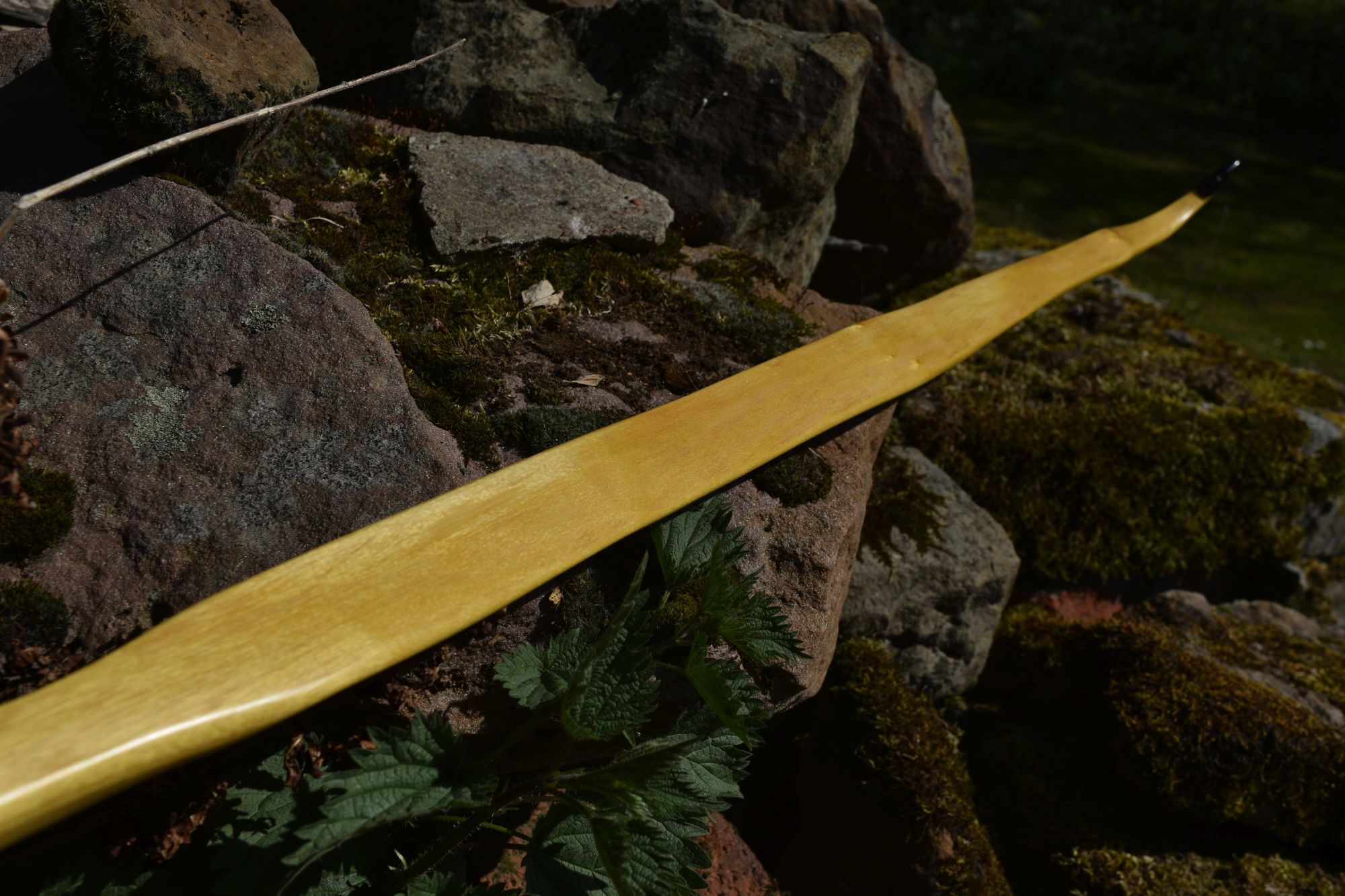 Hier ein neuer, klassisch gehaltener Osage mit Recurves. Leider haben sich beim Bearbeiten nicht weit unter dem ausgearbeiteten Jahresring schräg laufende Risse aufgetan. Ich hatte die Hoffnung, dass sie ganz rausfallen könnten. So ist der Bogen leider sehr dünn geworden und die Risse sind auch nicht ganz raus. Ich habe sie nun so gut es ging mit Epoxy verfönt. Gereicht hat es so nur noch für 31lbs und wenig Raum, um sich beim Tillern Fehler zu erlauben. Das Ganze ist aber nicht schlimm, denn der Stave war nur ein dünnes Seitenstück von 4cm Breite, das ich vom Hauptstave mit der Japansäge abgesägt habe. Insofern ist dieser Bogen ohnehin nur ein Bonus, der sich dazu noch sehr angenehm schießen lässt