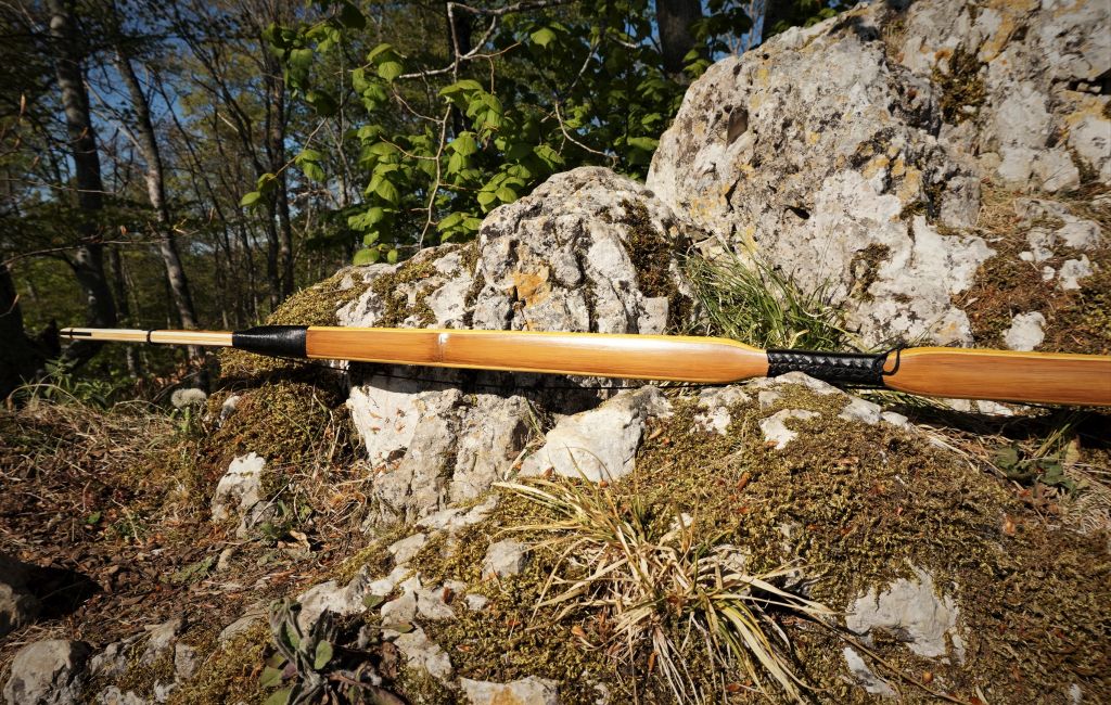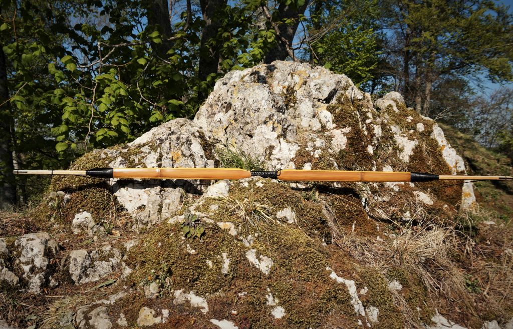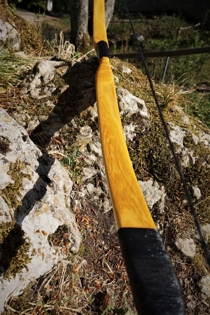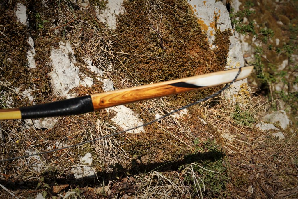 Der Bogen geht an einen Kunden, der bereits einige Bögen von mir bekommen hat. Die Siyahs wurden aus 10 Teilen erstellt und waren sehr aufwendig in der Herstellung. Der Kern wurde aus Kirsche und Wasserbüffelhorn erstellt. Auf beiden Seiten kam dann eine Lage Spitzahorn, darauf wiederum eine Lage aus Goldregen/Wasserbüffelhorn/weißes Rinderhorn. Das wirklich Weiße, was im Rinderhorn zu finden ist, war nicht einmal 1mm dick und lag natürlich nicht gerade im Horn. Es war nicht ganz einfach die weiße Schicht freizulegen. Aber es ist leichter wie Knochen, es war weißer und es hat die Siyahs so versteift, dass ich sie ein wenig leichter ausfallen lassen konnte. Dieser Bogentyp ist sozusagen meine erste eigene Bogenkreation, die ich jetzt in dieser Form anbieten werde.