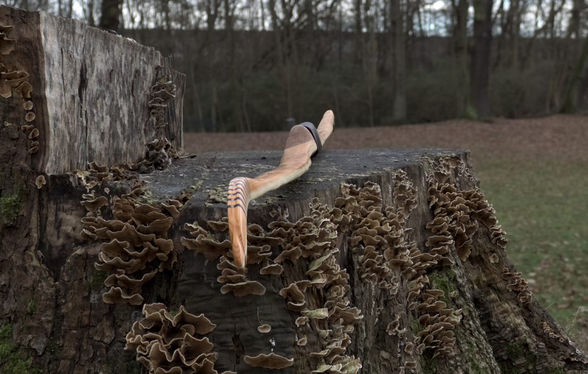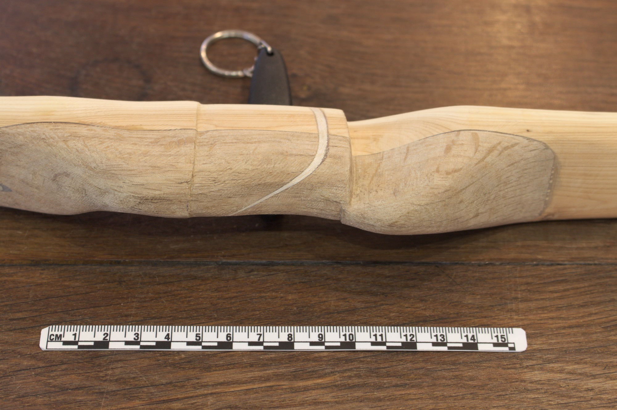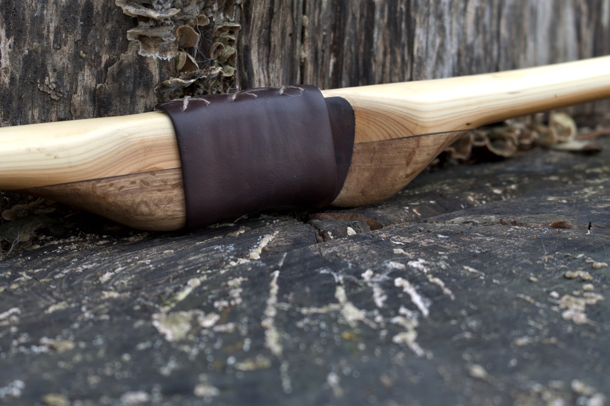 Griffaufsatz aus Eichenholz, Tipoverlays aus Wurzelholz unbekannter Spezies (beides Fundhölzer), Ledergriff