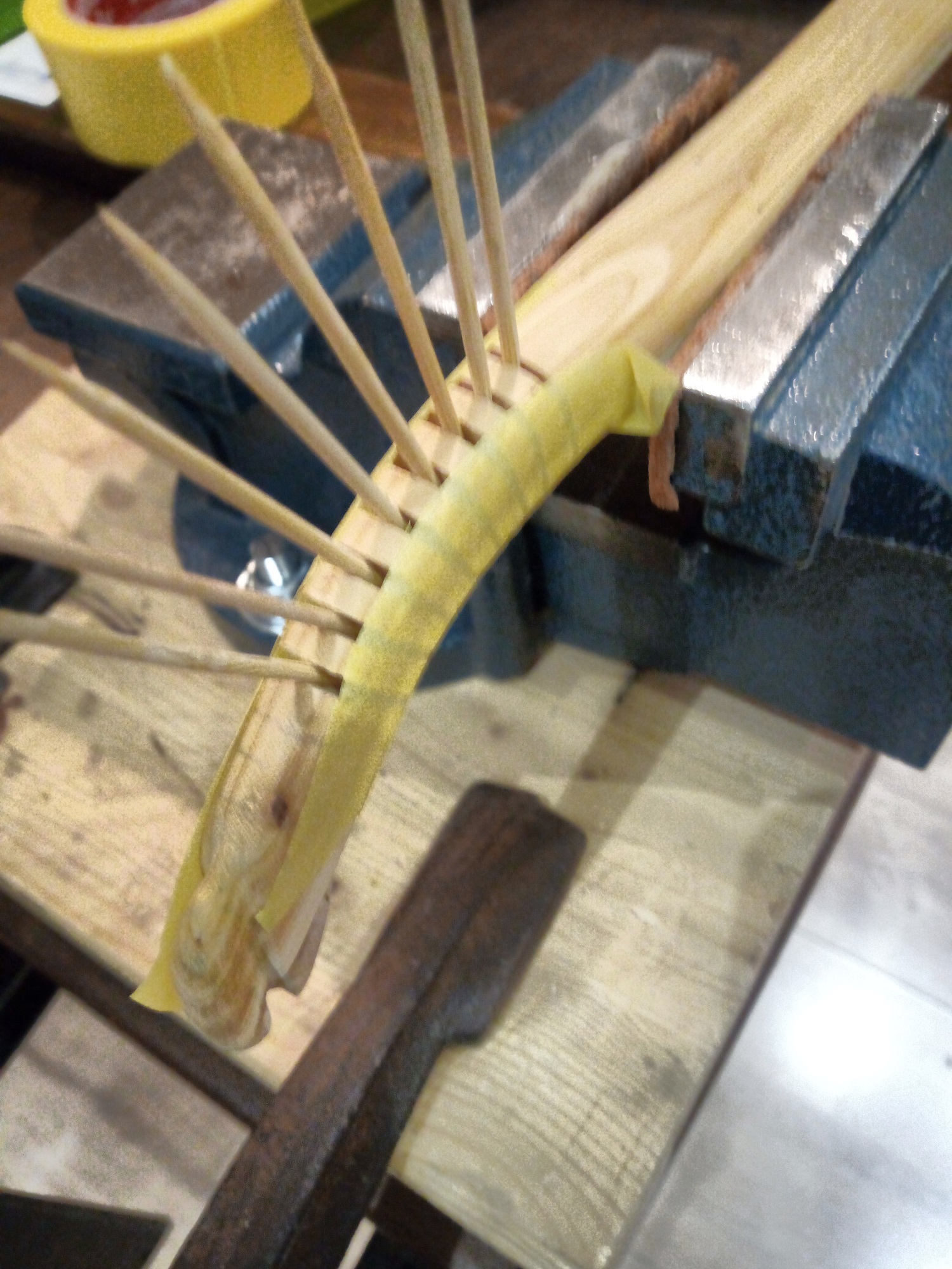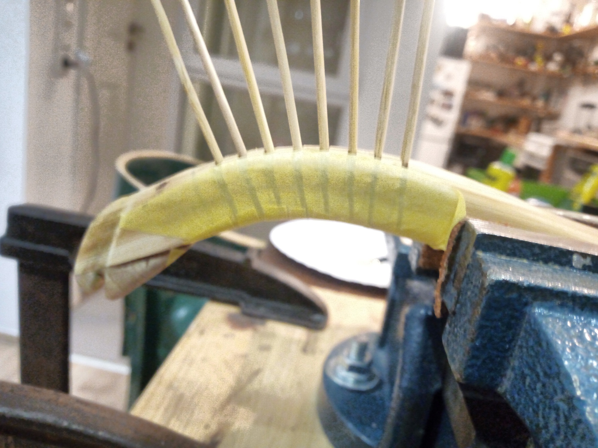 Gute Frage. Meine bisherigen Versuche mit Dampf waren nur bei Hasel erfolgreich. Bei der Dicke der WA Enden habe ich befürchtet, dass beim Versuch einen engen Radius in die letzten 10 cm einzubiegen, einfach die Enden steif bleiben und es dann am Übergang in die WA anfängt zu biegen. Dann kam mir die Idee das einfach mal auszuprobieren. Ursprünglich woillte ich einfach Keile einkleben, aber mach mal so viele kleine Holzkeile nur mit Handwerkzeugen... ;-)