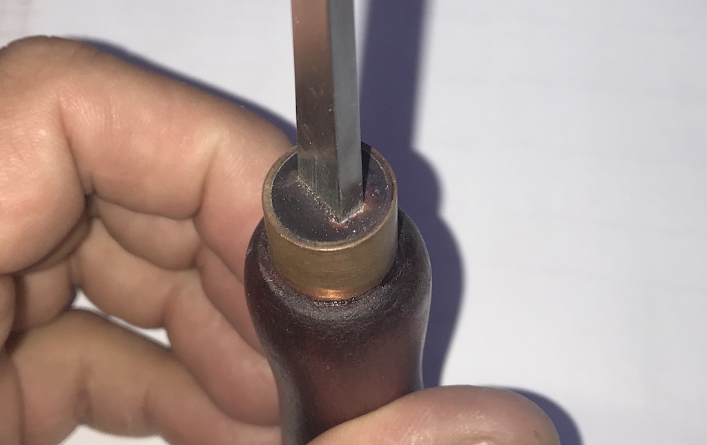Edelstahl und Hülse sind am unteren Ende verlötet (könnte man auch kleben) und dann mit Epoxy in den Griff geklebt. Ich hätte ja gerne etwas gebaut um die Blattbefestigung ohne Inbusschlüssel zu machen, aber rein von Hand konnte ich meine Idee nicht umsetzten. Vor drei Monaten habe ich eine alte durchgebrannte Stichsäge auf den Schrott geworfen. Da hätte nur den Sägeblatthalter ausbauen müssen und in den Griff kleben. (Mann soll halt nicht alles schon nach 5 Jahren zum Schrott bringen)