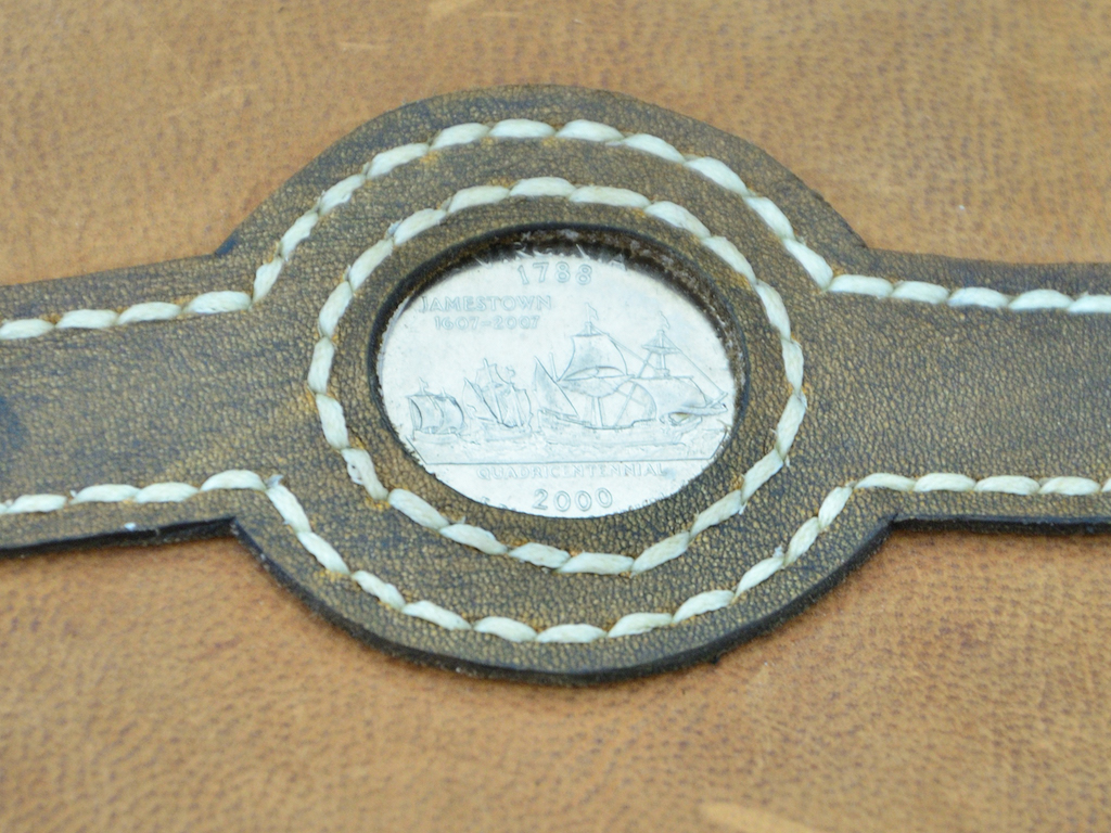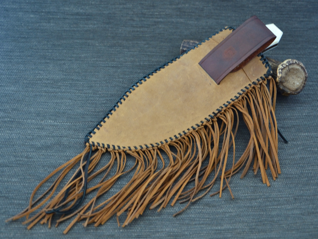 Die Scheide ist ist aus Rindsleder mit einem Ziegenlederüberzug. Die Fransen habe ich selbst geschnitten. Die Münze ist ein Virginia Statequarter als Anlehnung an die Herkunft der Klinge.
