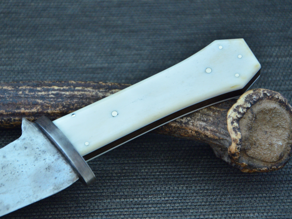Der Griff ist ein Sandwich aus amerikanischer Walnuss, Knochen und Pins aus Neusilber. Keine Neusilber Beschläge and Griffende.