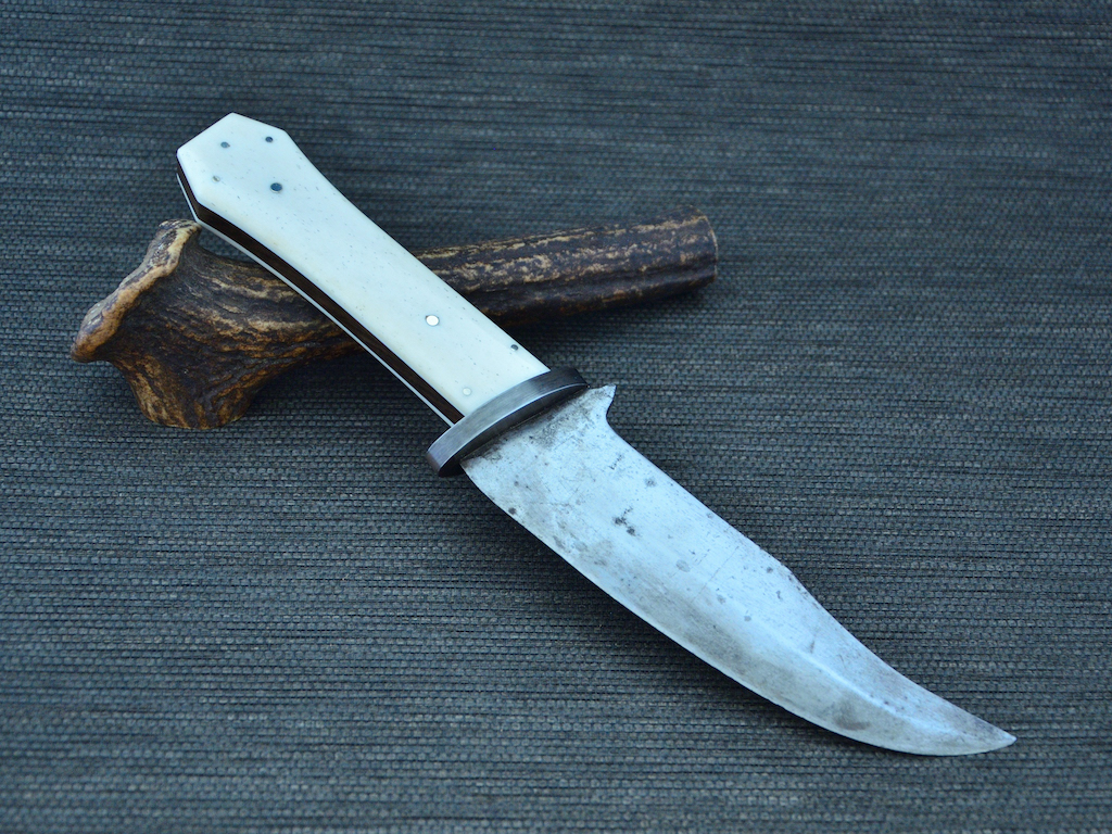 Der Griff soll ein Coffin handle Griff werden wie er zu dieser Zeit weit verbreitet war. Die Ideen habe ich mir in diesem Buch geholt: Coffin Handle Bowie Knives von James L Watson.