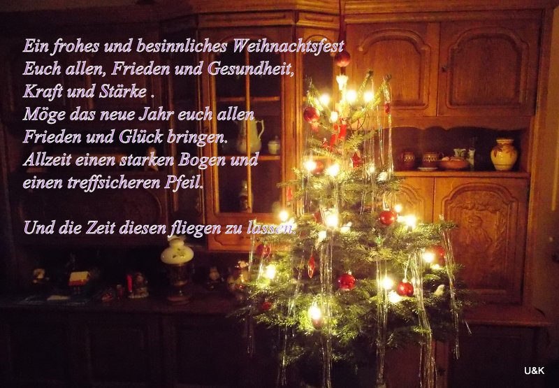 Aus der Moderatorenecke ein frohes Fest und einen beschaulichen 2. Weihnachtsfeiertag. Ich hoffe, ihr habt ordentlich Bogenzeugs zum Ausprobieren oder Basteln geschenkt bekommen und könnt euch nun erquicklich damit beschäftigen, während der Nachwuchs um euch herumtobt.