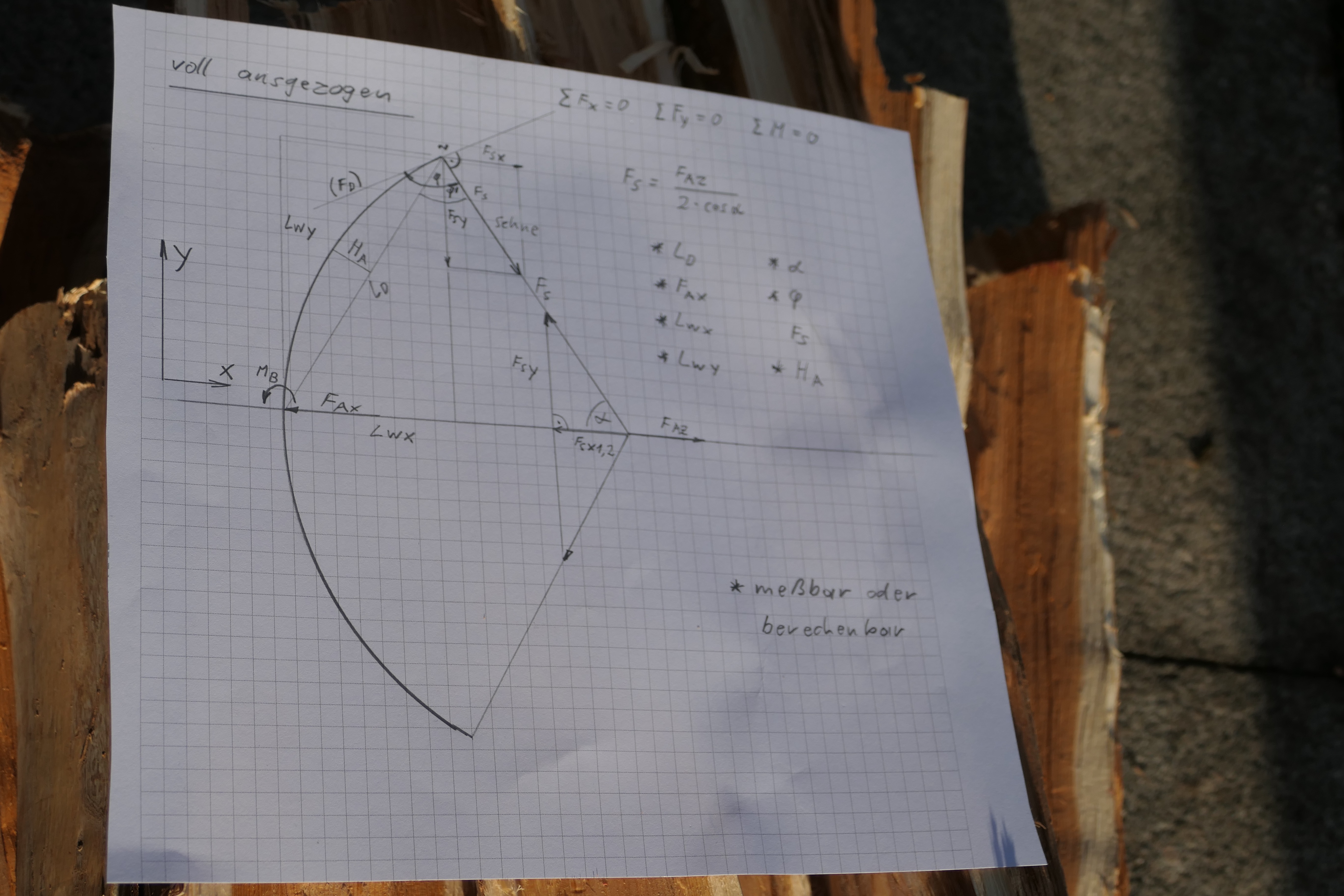 Es gibt noch eine Druckkraft auf den Bogen, die im Vollauszug bei Phi ca. 90° aber vernachlässigt werden kann.