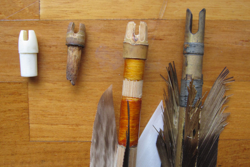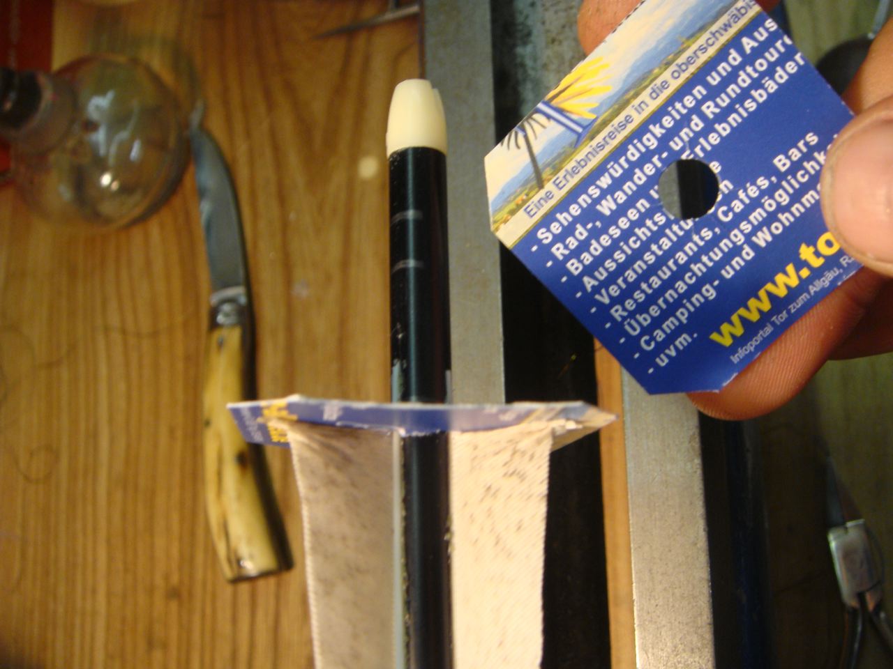 Die Pfeile, die ich von Gervase geschenkt bekommen habe, hatten zu Anfang die Nock europäisch aufsitzen. Nachdem ich eine Weile mit den Pfeilen geschossen hatte ging es mir ziemlich auf den Keks, dass ich mir dabei die Leitfeder platt drückte. Also habe ich die Nocks runter gemacht und neue, mit der Leitfeder nach oben, drauf geklebt.