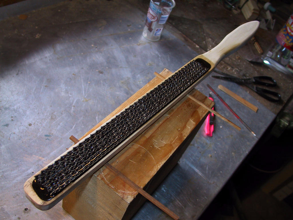 Wenn jemand lauter gleiche Blätter zu verarbeiten gedenkt , hat es zwar leichter, sollte dabei aber trotzdem darauf achten die Stück so zusammen zu kleben, daß die Zähne „auf Lücke“ und nicht in einer Reihen stehen. Als nächstes habe ich den Holzkorpus „zurechtgeschnitzt“.