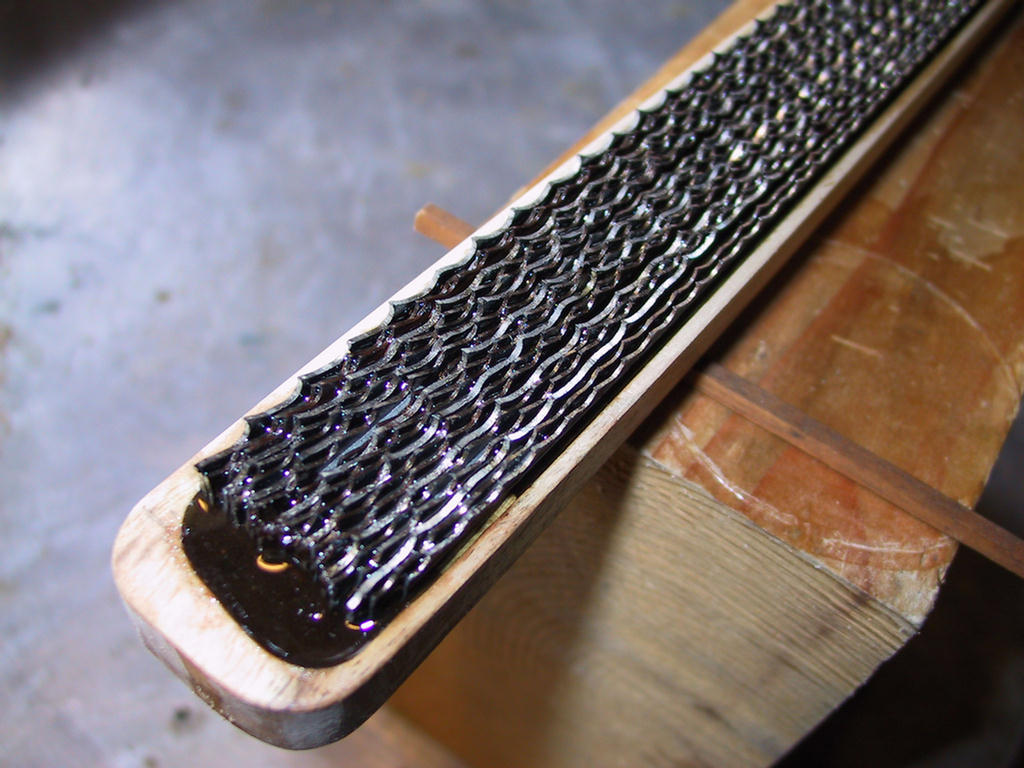 Länge und Breite wird einfach von dem Packet abgemessen und diese Eingießwanne dann ca. 1mm größer ausgelegt. Jetzt wird der Holzkorpus genau waagrecht ausgerichtet aufgelegt und das Harz angemischt (ich verwende jenes von R&G Type L). Für meine Wanne habe ich ca. 85g fertig gemischtes Harz gebraucht. Die erforderliche Menge hängt natürlich von der Größe des BS-Pakets ab.