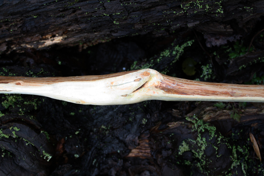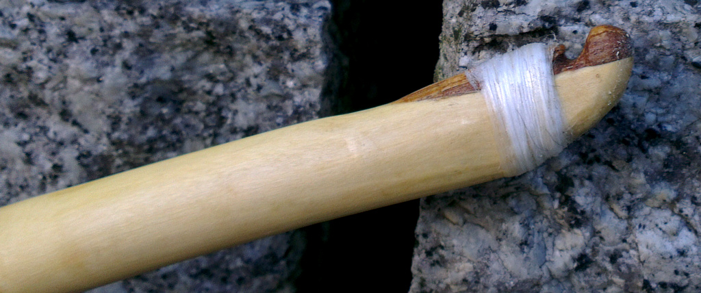 Bauch und Sehnenverlauf Rücken mit Bastresten hier die namensgebenden Frasspuren im Holz zu den Tips hin den Bast entfernt... und wieder die altbewährten Wickelnocks aus Hanf und ein paar Tröpfchen Sekundenkleber - schnell gemacht, leicht und stabil