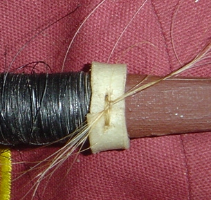 nasser Rohhautstreifen am Ende der Pferdehaarwicklung, mit Kuhhaaren befestigt