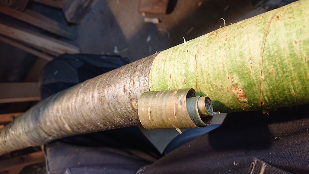 Den Sapling habe ich in der Länge halbiert und kurz unter die heisse Dusche geschickt. Danach vom einen Stück die Rinde samt Kambium(glaub ich) längs abgezogen und vom anderen Stück nur die äusserste Schicht spiralförmig.