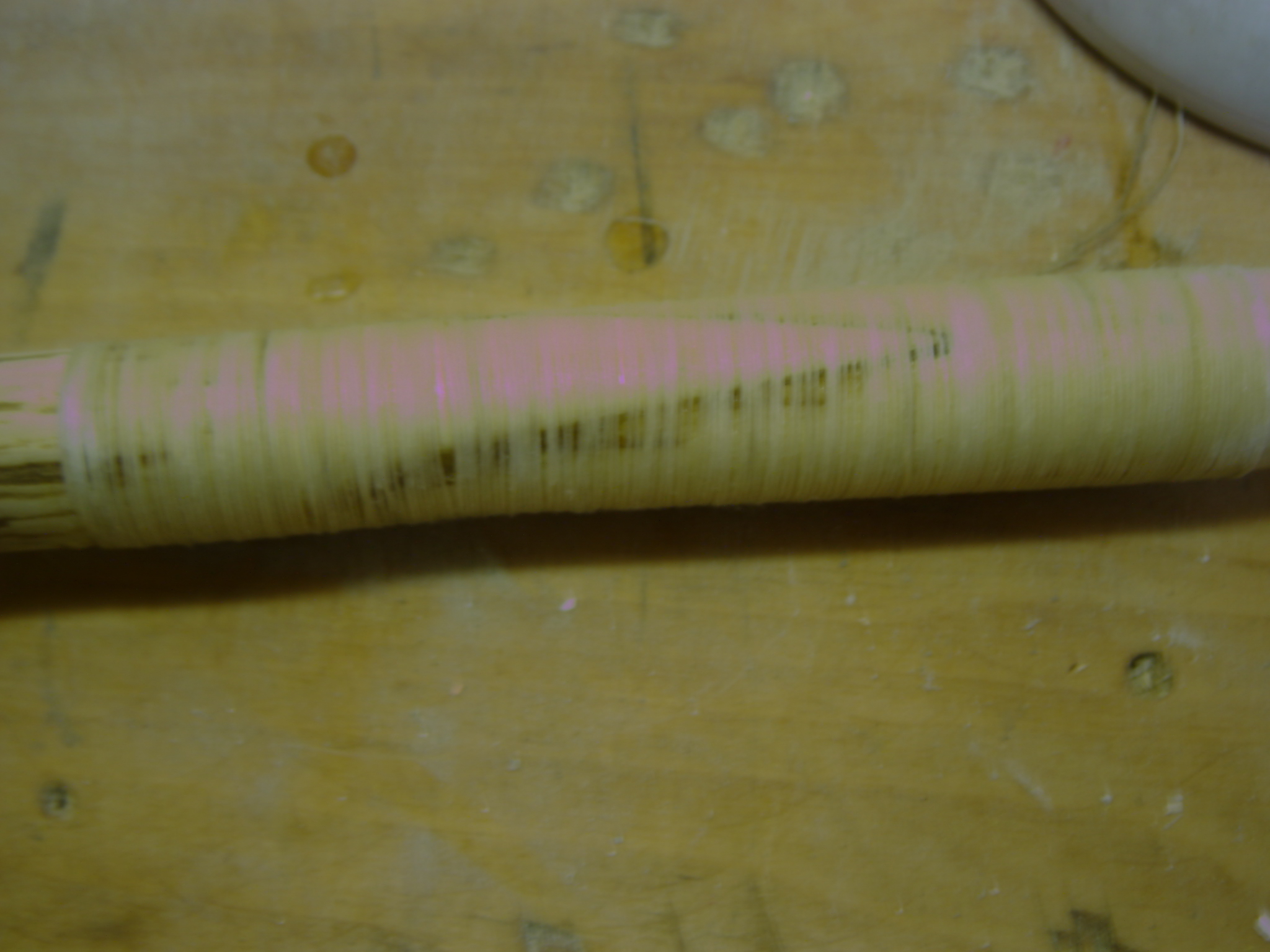 Gleich danach mit dem Tillern angefangen, ist jetzt zu 90% fertig, mehr als 35# wollte ich dem Spleiss so kurz nach dem Kleben noch nicht zumuten, daher habe ich den Spleiss mit Leinengarn(getränkt in Uhu sofortfest) gewickelt.