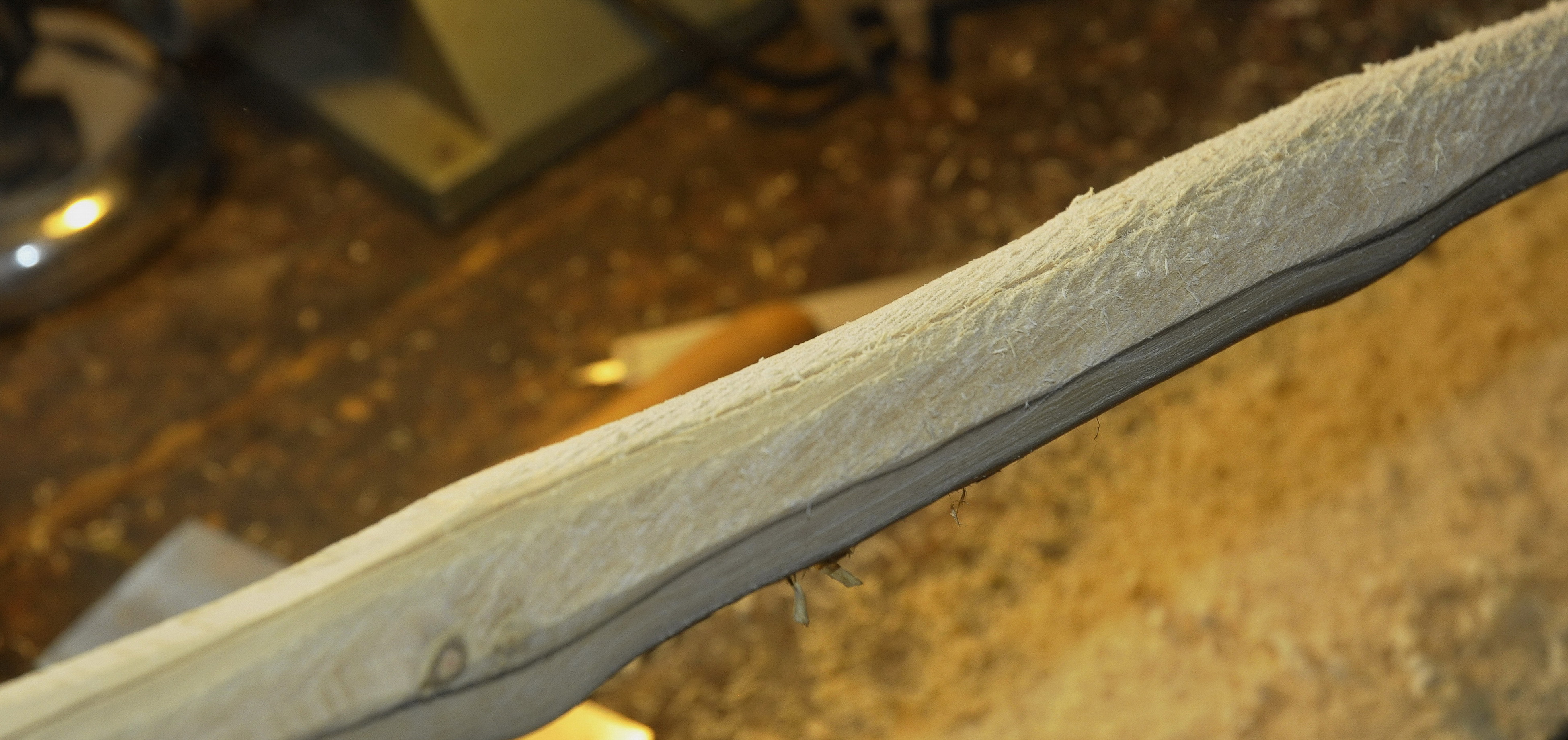 Der Holler ist nun von 180 auf 150 cm gekürzt worden, leider ist das Zuggewicht immer noch sehr gering so um die 33# bei 28", die Enden flippen geht auch nicht wegen der Nodien an den Tips. Mal sehen ob das noch was wird. Die Overlays hab ich dicker gemacht um beim Sehnenwinkel etwas herauszuholen, ist sehr mühsam wenn nicht genug Holz da ist. Trocken ist er auf jeden Fall und ausgezogen hab ich ihn auch schon bis auf 27", leider ist die Biegung halt Griffnah viel zu stark.