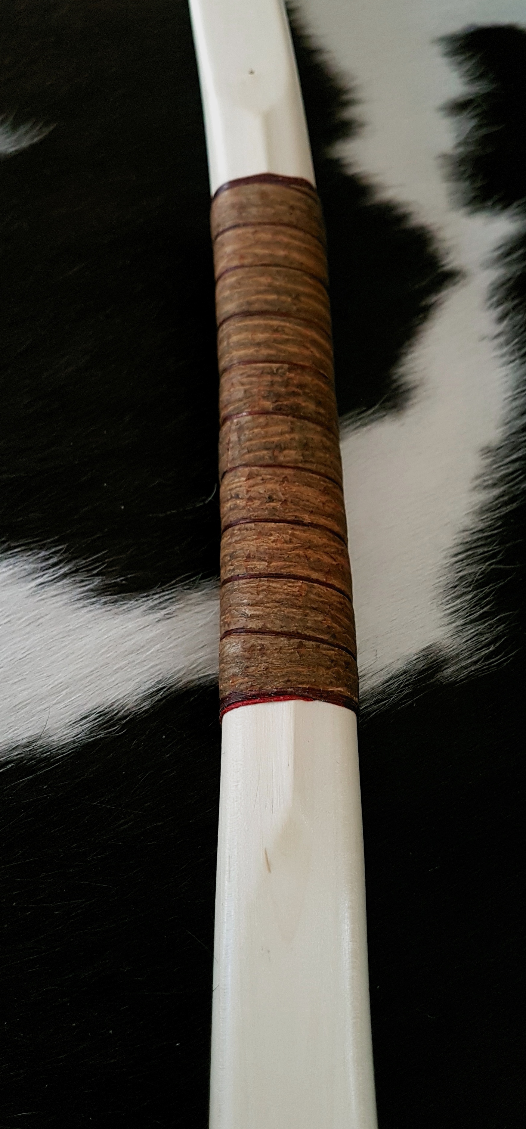Die Inspiration zu diesem Bogen waren die Oberflacht-Bogen. Der Griff biegt bei dem hier etwas mit, ganz steif ging aufgrund der Saplingdicke nicht. Aber egal.