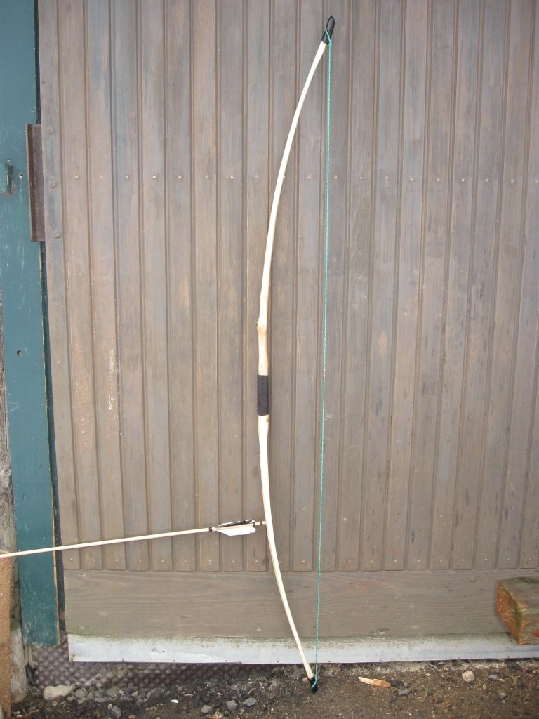 In meiner Jugend hatte ich mal einen Holunderbogen aus einem Zweig mit Rinde, der so als Stock ganz wunderbar geschossen hatte, allerding auch eher 8 denn 10 lb hatte. Aber sowas wollte ich mal ausprobieren, sozusagen ein Sapling in Reinkultur: Zwei Äste, nur die Rinde ab, zu den Enden ein wenig konisch hin geschnitzt, im Griff verleimt, Sehne dran, fertig. Natürlich mußte er dann für die Präsi doch noch aufwändig geschliffen und gebohnert werden und bekam auch eine yumi-mäßige Wicklung an den Griff.