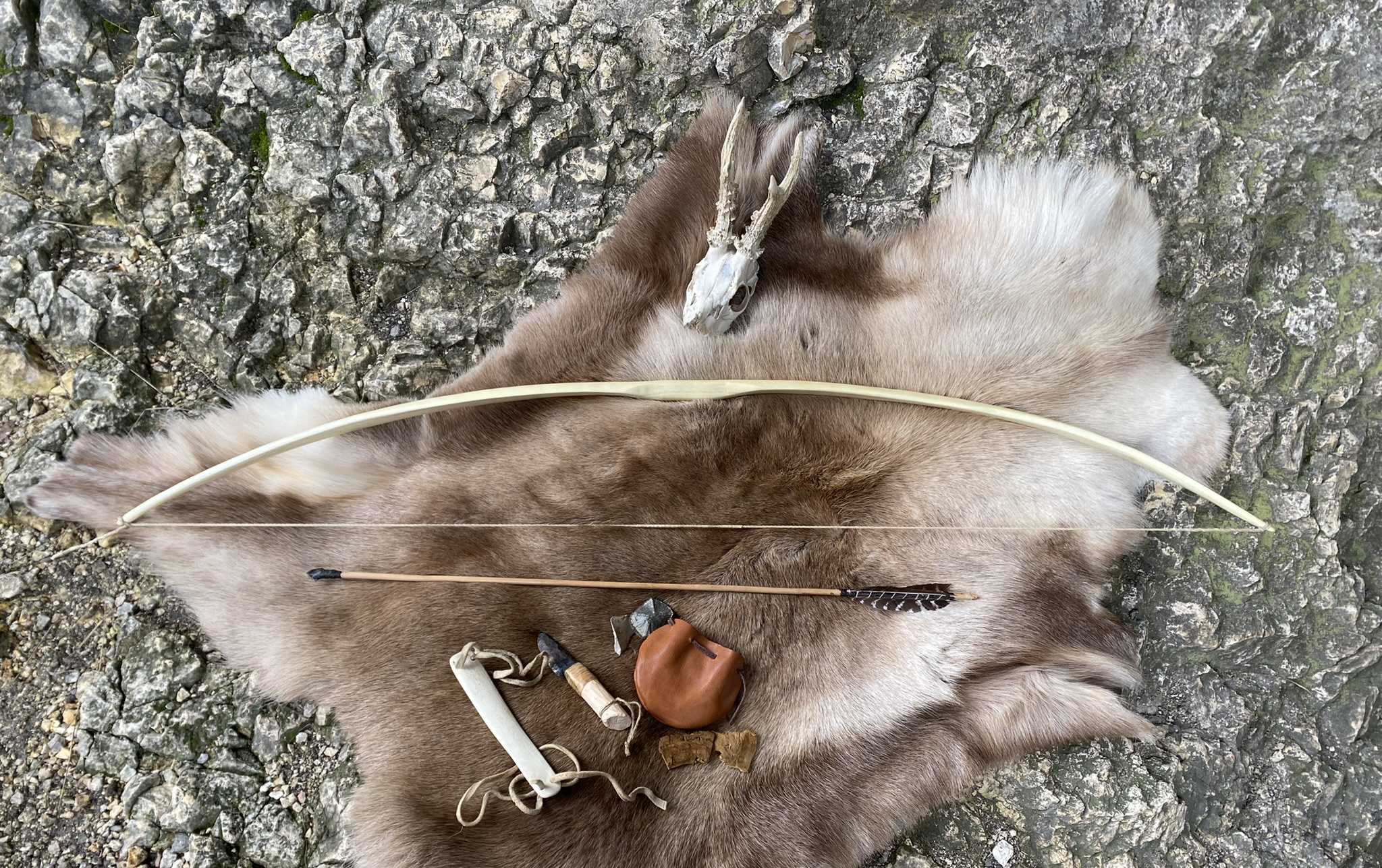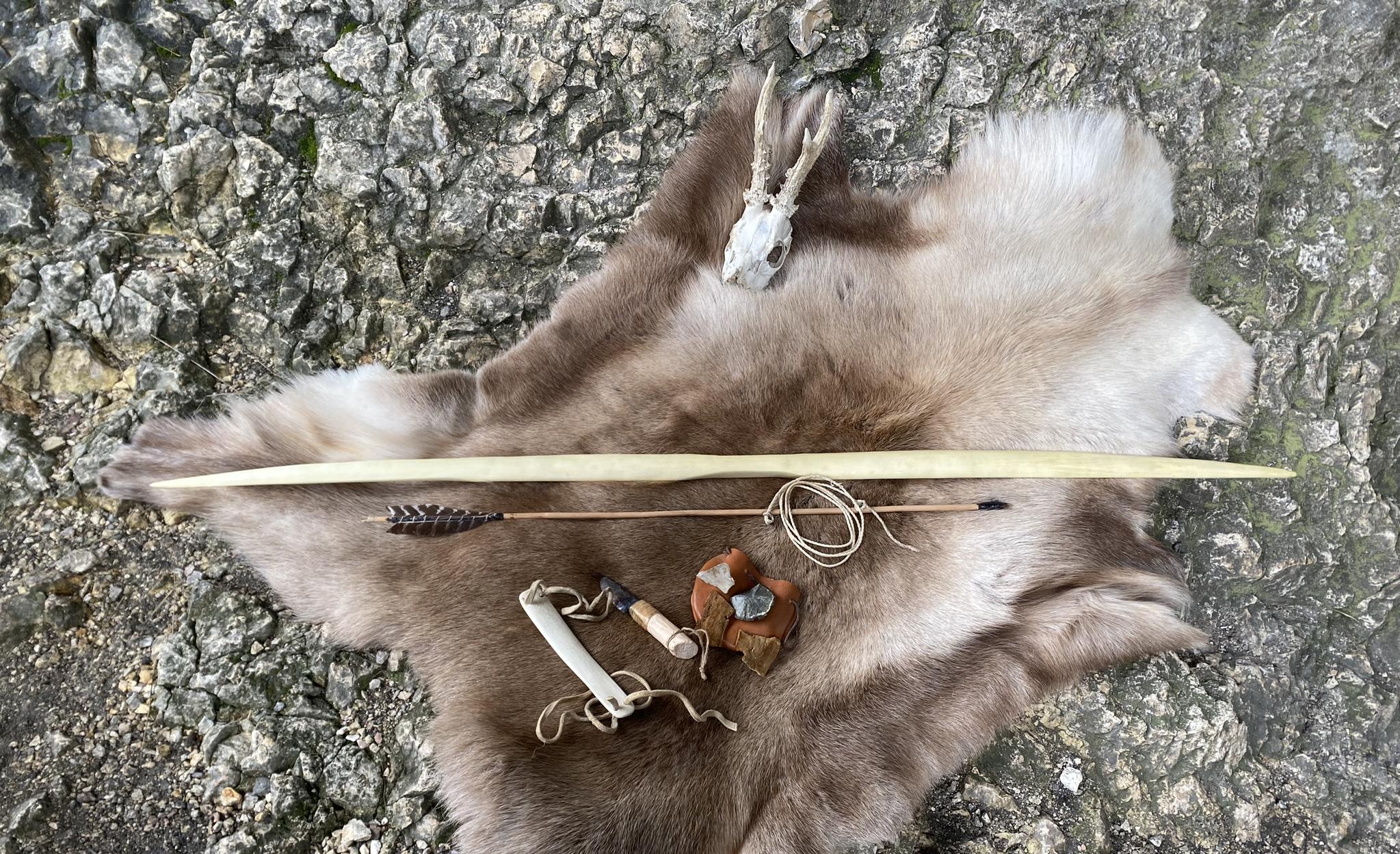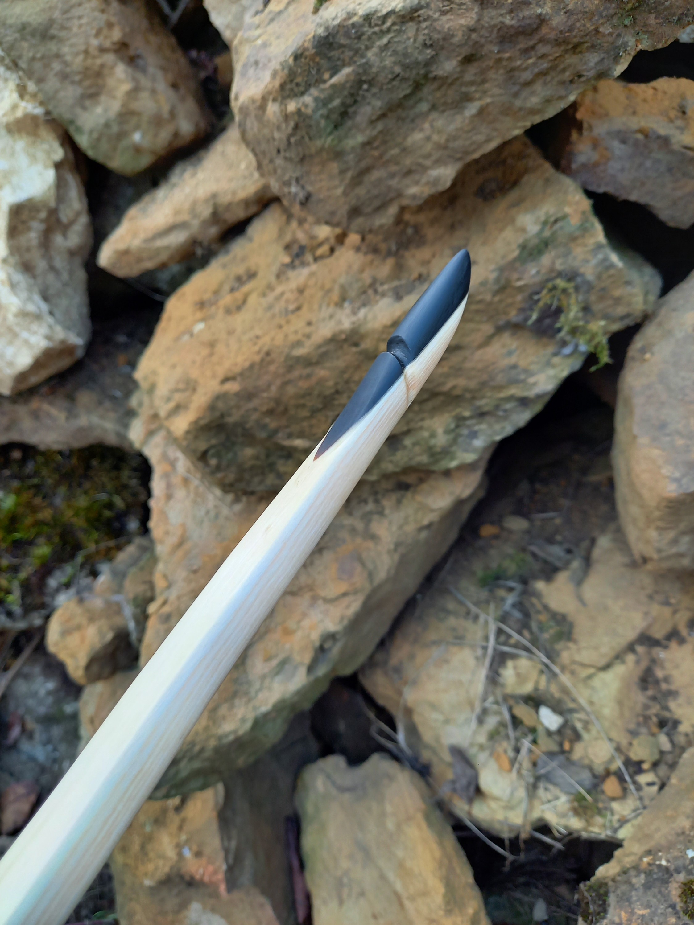 Pfeil: Wolliger Schneeball, Dreiecks-Feuersteinspitze, selbstgekochtes Birkenpech, Brennesselschnur, Rothirschsehne und (oh Schande) Truthahnfedern :o .