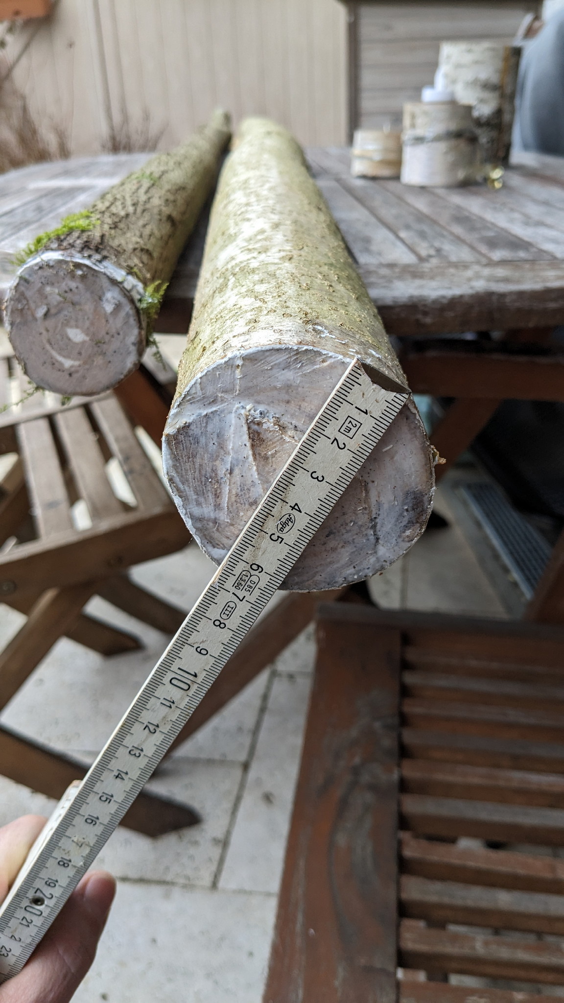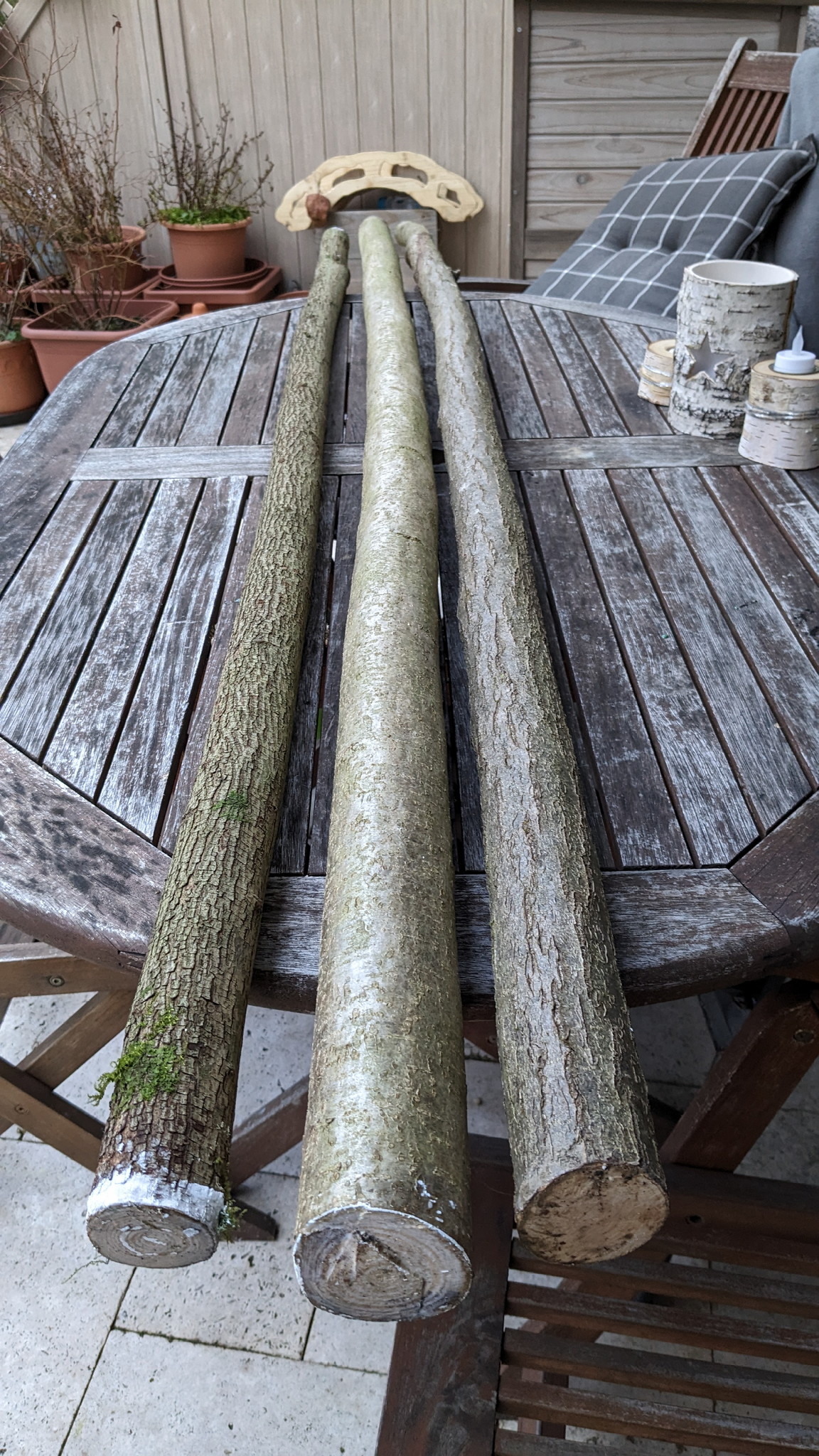 Zuerst der Hasel. War lang genug für zwei Stücke, oben ist er aber doch sehr knotig und ich werde wohl nur den unteren Teil verwenden.