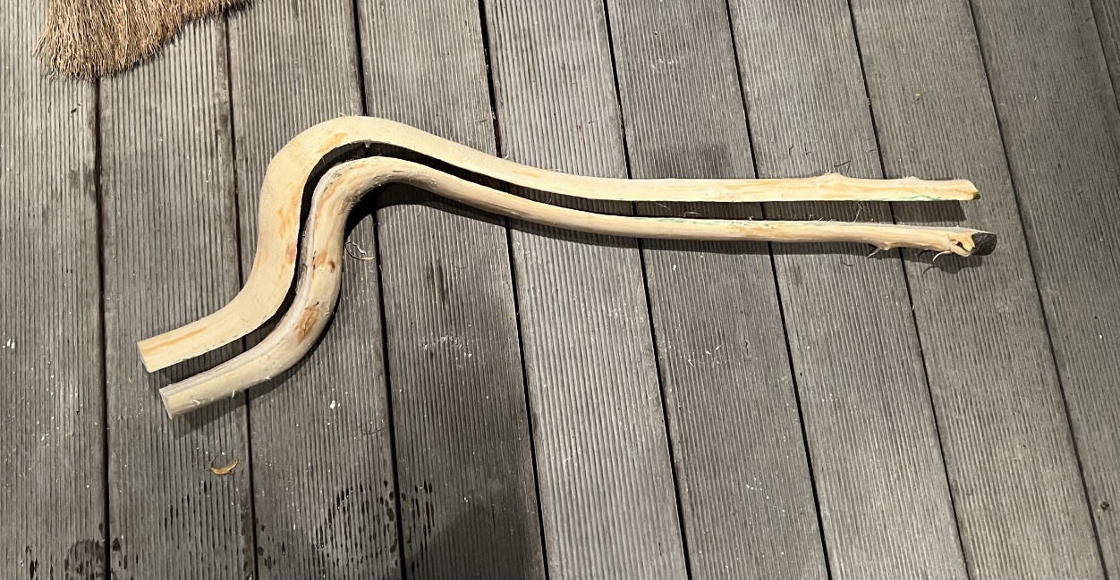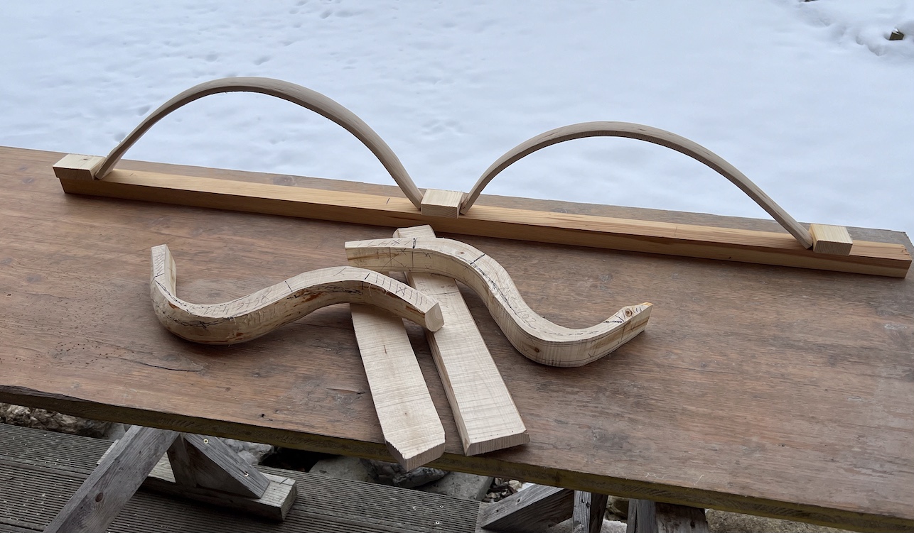 Heute erste Biegeversuche mit Ahorn und Hasel für die Wurfarme. Ahorn hat sich kalt nicht biegen lassen. Holzfeuchte 25%. Hasel ist viel zugfester und hat sich nass und ohne Erhitzen bei 24% Holzfeuchte problemlos biegen lassen. Dann noch ein Holzbrettchen aus dem Hasel für die Tips gesägt. Morgen baue ich die Form für den 2. Wurfarm. Den Wurfarm habe ich schon mit der Bandsäge ausgeschnitten, dann mit der Raspel in Form gebracht und alles mit der Ziehklinge geglättet.lG Stephan