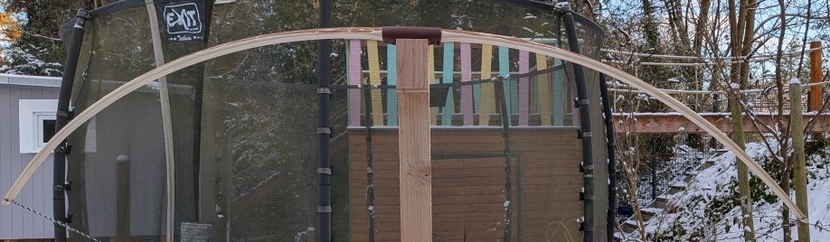Der Bogen in Grobform durfte ca. 3 Wochen drinnen trocknen, hat stetig Gewicht verloren, aber insgesamt nur noch 20g. So sah er dann vor dem Tillern aus und dann ging es letztes Wochenende los. Nach 3 Abenden Tillern und einen Abend Finish, sieht er jetzt so aus: Der Knick links außen stört mich noch etwas. Der war mitten im Tillerprozess plötzlich da (bei vielleicht 30# bei 15" Auszug). Die Stelle habe ich dann nicht mehr angefasst, aber ganz wegbekommen habe ich ihn nicht. Das ist jetzt mein Kompromiss zwischen nur noch wenig Knick aber auch nicht zu schwach. Hoffen wir, dass es hält.