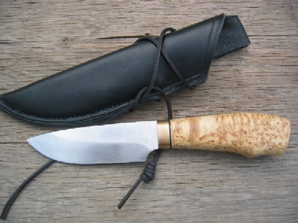 Die Klinge ist aus 1.2842 gehärtet auf 60 HRC, Griff: Bronze, schwarzes Fieber und Maserbirke. Die Scheide ist aus Leder mit Holzkern und das mit dem gerade nähen klappt jetzt auch so langsam.