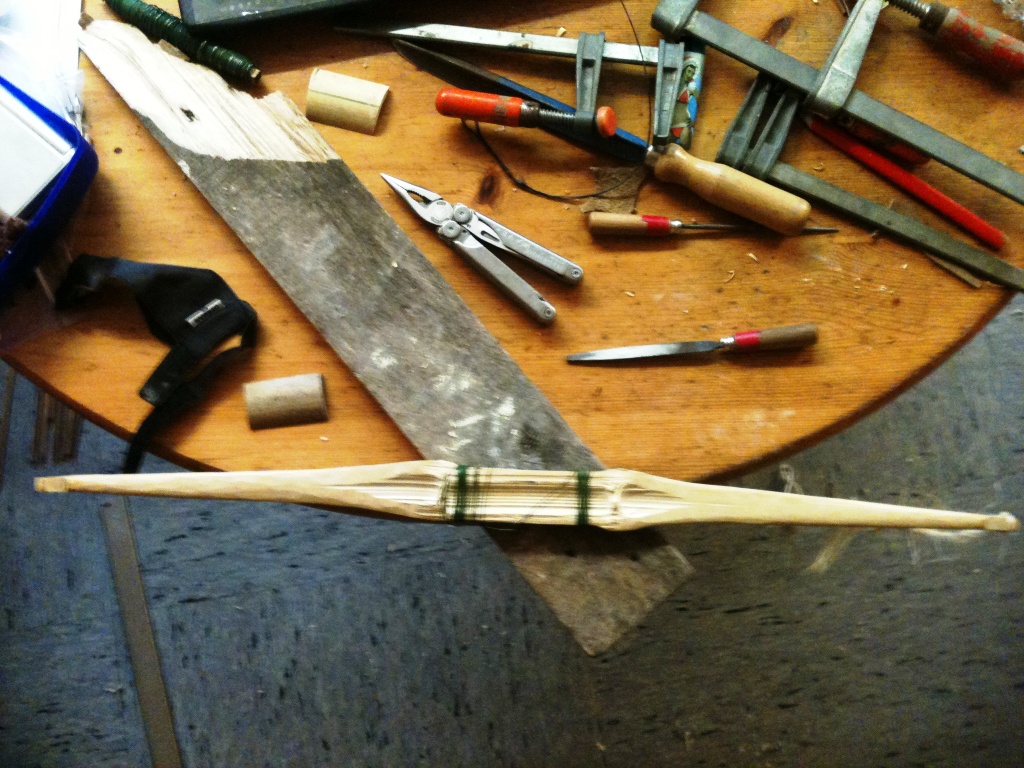 Bei meinem Bambus musste ich feststellen, das ich eine bestimmte Stärke (ca. 4-5mm) in Wurfarmmitte stehen lassen musste. Sonst haben die Fasern keinen Halt mehr und es knackt. Ich habe dann über die Seite und Kante getillert. Dadurch wurde er zum Ende recht schmal und ich hatte nicht mehr genügend Material für Sehenkerben. Hab mir dann aus Abschnittresten Tips gebastelt und mit Uhu Endfest aufgeklebt. Den Griffbereich habe ich erstmal gar nicht bearbeitet. Wollte nach den ersten Versuchen nicht so viel Arbeit investieren und hab mich ganz auf die Wurfarme konzentriert. Nachdem ich gemerkt habe, das es klappt, habe ich das so gut es eben noch ging zusammen gebastelt. Werkzeug: Feile, Messer, Säge und ein bisschen mit der Proxon.