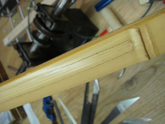 Abschliessend wurde der Bogen ausgleichend seitlich abgeschabt (unterhalb der Bruchstelle und am oberem WA) so dass die Bruchstelle im Bogen wieder harmonisch mitbiegt - viel hat es da auch nicht gebraucht da der Bogen eh auch mit Carbon war.