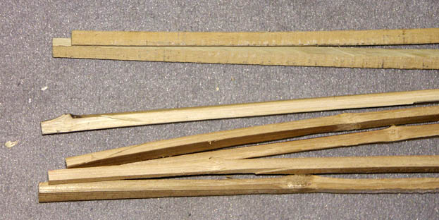 Vom zweiten Bauchnodium oberhalb und vom ersten Bauchnodium vom Griff ausgehend werden die Leisten von 3 auf 2,5 mm Breite gehobelt, so dass das innere Packet etwa 15 bis 12,5 mm breit ist. Darauf kommt dann die Robinie.