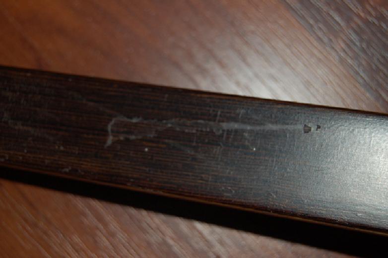 Aus welchem Holz ist das Furnier? Vielleicht ist es als Zierde ein Tropengehölz und daher enthält es Öle. Das würde erklären warum der Lack nicht so gut hält wie auf anderen Bögen.