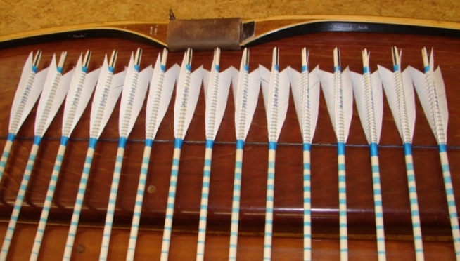 Hier mal meine neue Munition für meinen Hill – Bogen. Ich habe vorher noch nie Pfeile so aufwändig hergestellt. Zuerst die Schäfte bei meinen HdV ausgesucht, alles Kiefer 11/32 mit optimaler Maserung und einen Spine von 71# und 72#. Dann Inlays aus 3mm Büffelhorn eingeklebt und Selfnocken angebracht. Danach die hintere Hälfte der Schäfte weis gebeizt und die Schäfte einmal dünn lackiert. Darauf dann mein Cresting diesmal in blau und eine weitere Lackschicht. Dann die Schäfte abgelängt und ausgewogen. Alle Schäfte so oft lackiert bis der leichteste Schaft auf das Gewicht des schwersten Schaftes kam. Der leichteste Schaft hat über 25 dünne Lackschichten. Zu dem Zeitpunkt noch +- 2 grain dann die Federn ausgewogen und befiedert. Danach die Pfeile ausgewogen und die Wicklungen angebracht, auch in blau, bei den leichtesten Pfeilen die längsten Wicklungen. Dann die Wicklungen zum Schutz lackiert und wieder die Pfeile ausgewogen. Dazu die 125 grain Spitzen ausgewogen und montiert. Zum Schluss habe ich die Pfeile mit Stahlwolle oder Lack auf 660 grain gebracht + - 0,4 grain, eigentlich wollte ich 665 grain erreichen, mal sehen vielleicht bringe ich noch 5 grain Lack auf. Die Pfeile sind im Gewicht genauer wie meine Carbonpfeile. Auf jeden Fall genauer als ich jemals schießen kann.