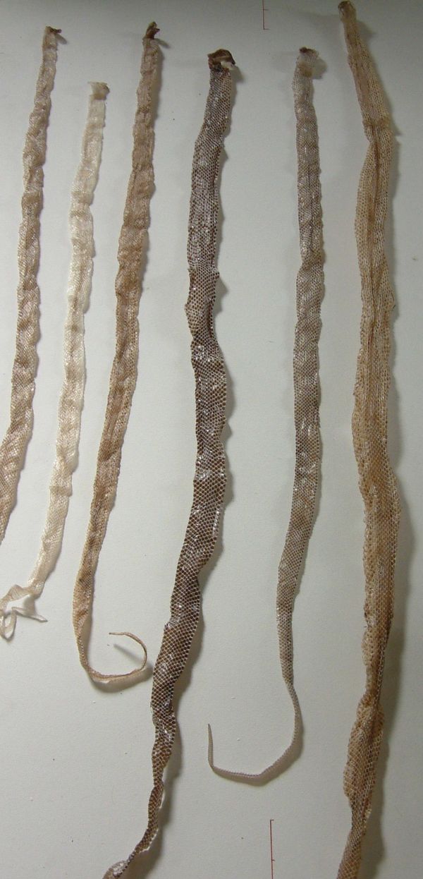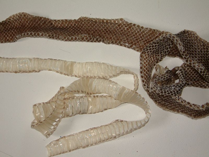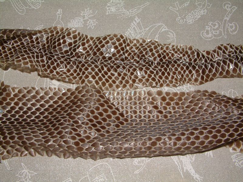 In der Mitte ein Natternhemd, welches nicht schuppt, auf unbehandeltem Holz (Eberesche), links und rechts auf farbig gebeiztem Untergrund mit einem Natternhemd, welches gerne Schuppen verliert. Es wurde auch von oben noch mit Endfest bestrichen und danach überschliffen und lackiert. Hält jetzt; es gibt aber noch keine Gebrauchstests über lange Zeit. Ich würde lieber die "nicht-schuppende " Haut verwenden, auch wenn sie nicht so schöne, dunkle Schuppen hat wie die Peitschennatter im Bild links und rechts.