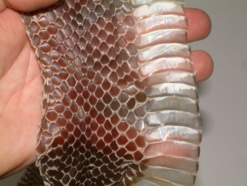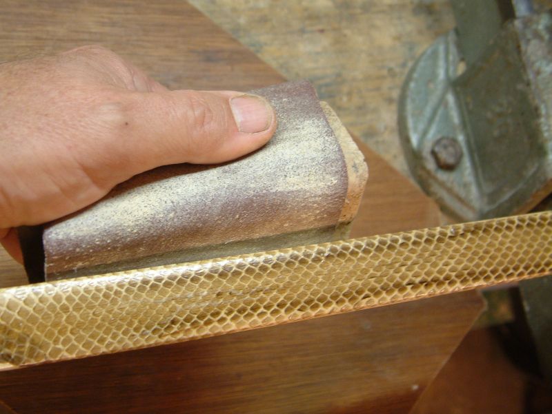 Danach wird die Haut aufgerauht für die Lackierung. Diese ist zwingend notwändig. Man muss sich das so vorstellen: Auf dem Holz wird die dünne Hornhaut mit dem Kleber fixiert, auf der Oberseite ist sie noch ungeschützt und kann u.U. leicht abgerubbelt werden. Ich rauhe immer mit Stahlwolle auf. Wenn sich hierbei die Schuppen lösen, haben wir nicht immer ein Problem. Es gibt Schlangenhäute, bei denen halten die Schuppen, bei den Natternhemden ist es ähnlich, z.B. bei der Vierstreifennatter halten sie, bei der Peitschennatter nicht. Werden nun die Schuppen runtergerubbelt, so hat man immerhin noch eine Schlangenhaut-Struktur, die auch ganz gut aussehen kann (Bild kommt später).